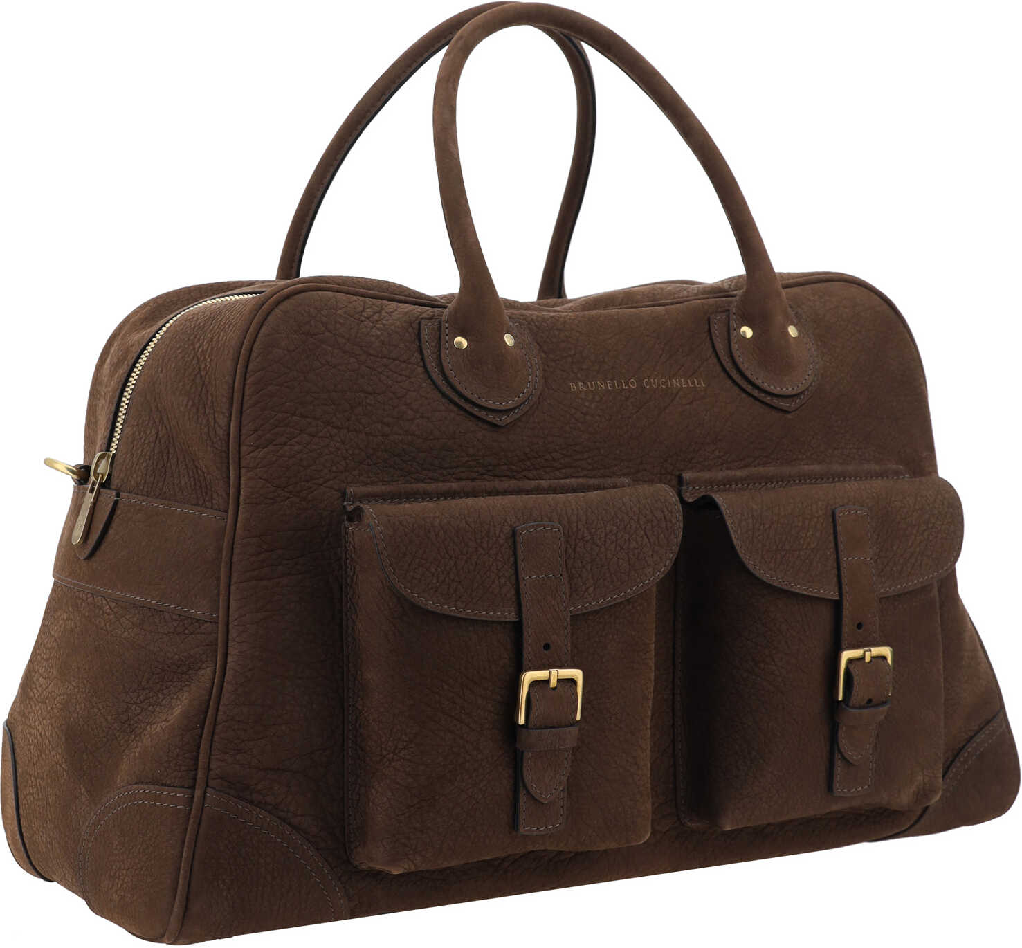 Leather Travel Bag by Brunello Cucinelli, double padded top handle, top closure by concealed zipper, double front pocket with flap closure equipped with double straps with metal buckles, iconic brand signature press-stamped on the front, rigid design, multiple compartments with rigid dividers, removable and adjustable flat shoulder strap, suede design.