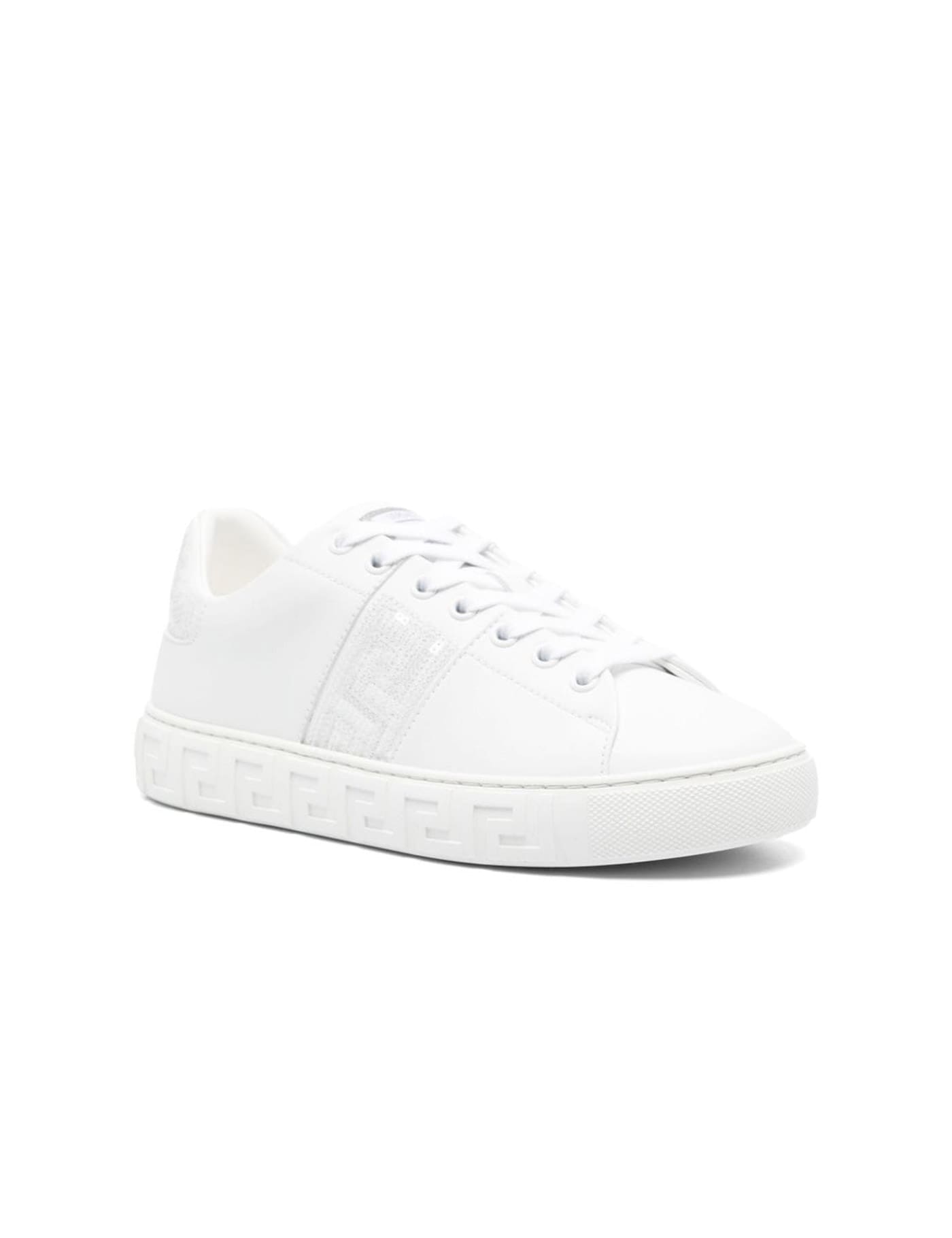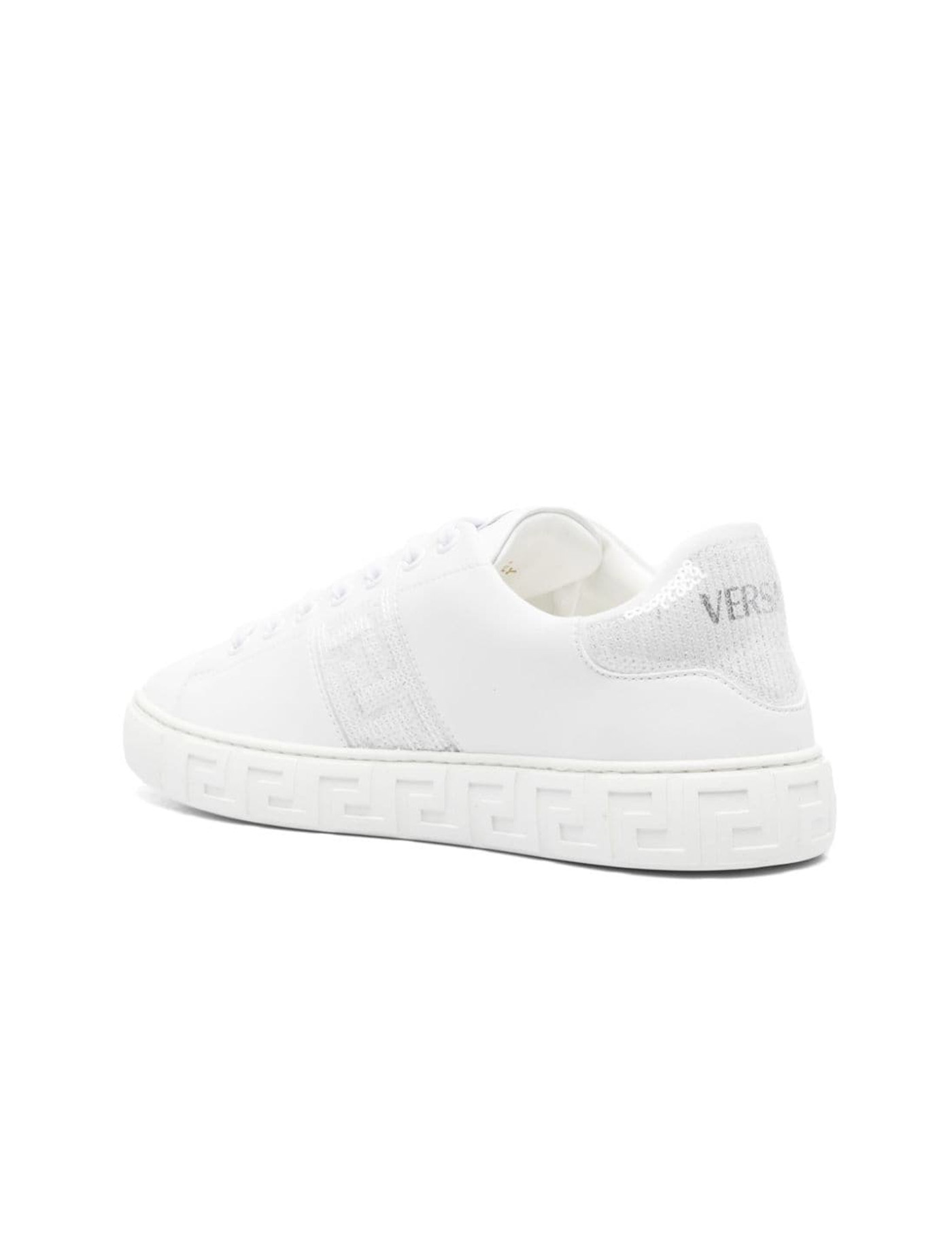 Versace sneakers made of eco-leather with a side Greek pattern and sequin spoiler. Front lacing, fabric logo patch on the tongue, internal eco-leather lining with removable insole, and rubber sole with raised Greek design.