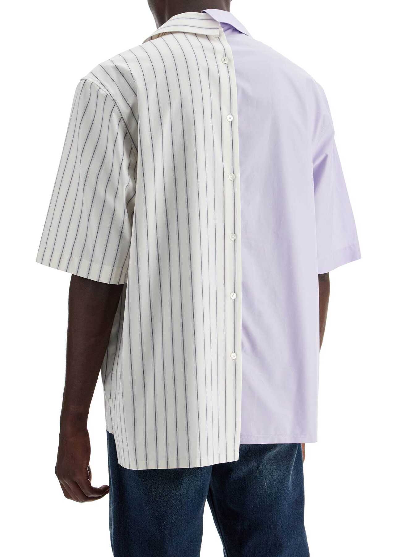 Crafted in pure cotton and featuring a relaxed boxy cut, this Lanvin bowling shirt stands out for its asymmetrical panel design, with one solid color panel and the other in stripes. It features a Cuban collar, front and back button closure, and is finished with a patch pocket on the chest and side slits at the bottom. The model is 187 cm tall and wears a size 40.