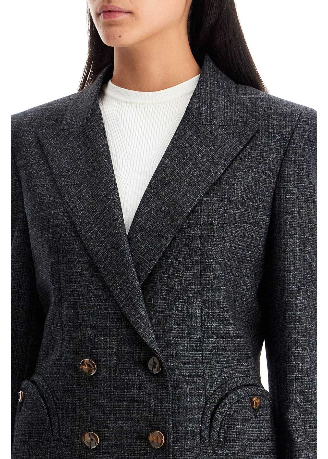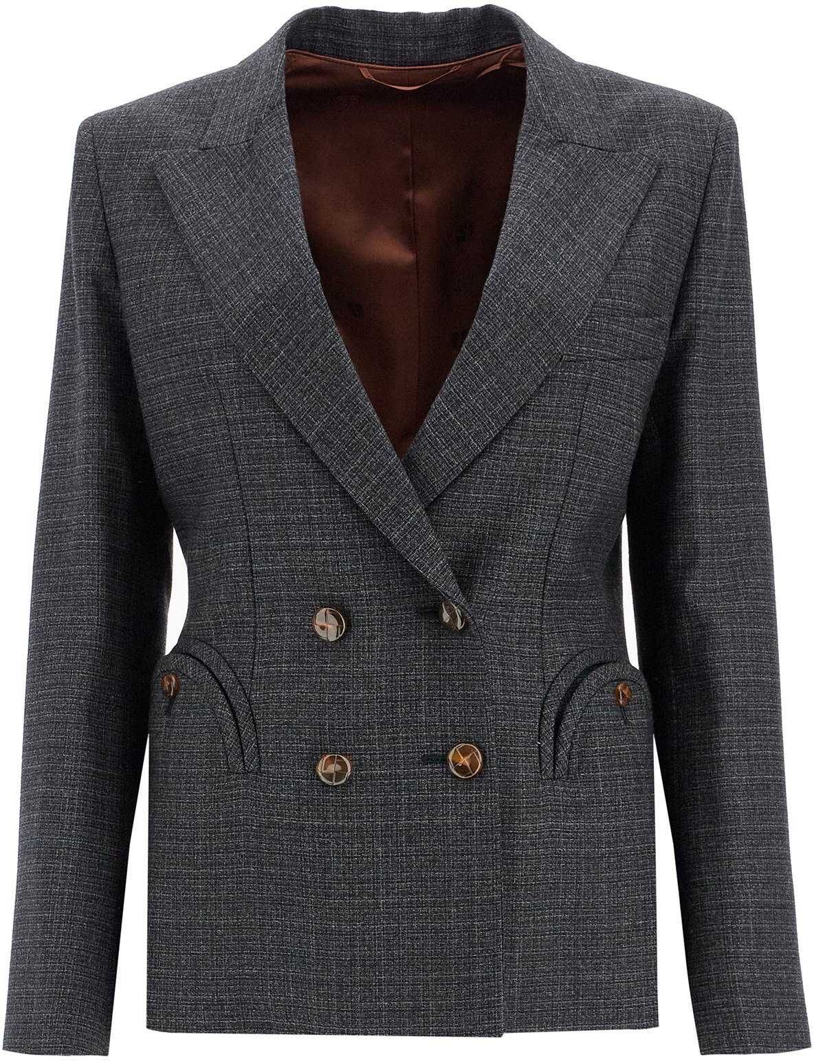 The Hunley double-breasted blazer from the Charmer line by Blazé Milano is inspired by equestrian style. Made of pure virgin wool with a subtle check pattern, it features peak lapels, iconic Smiley pockets on the front, padded shoulders, and shiny buttons inspired by loden. The fully lined interior has two pockets and a slim fit. The model is 177 cm tall and wears size 1 Blazé Milano.