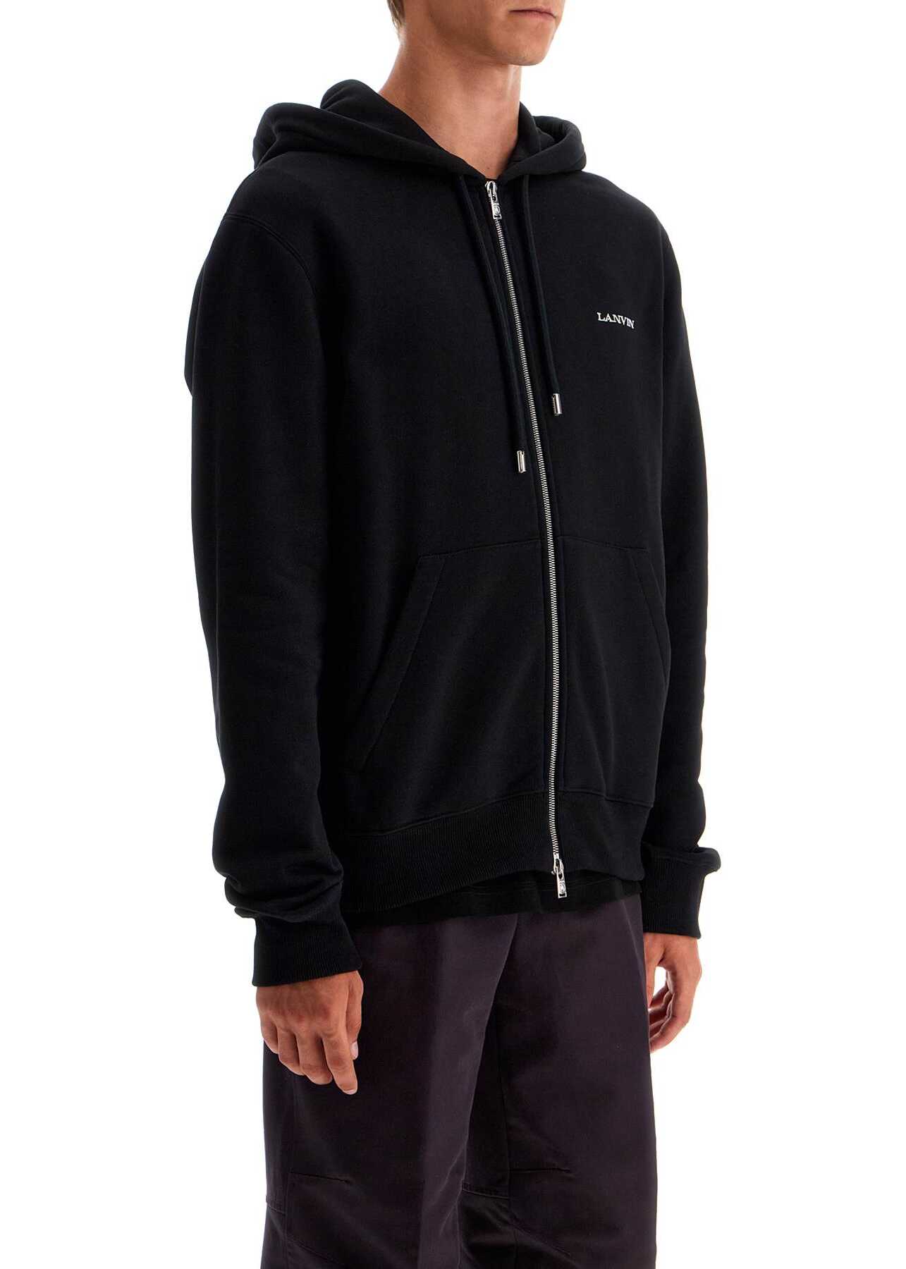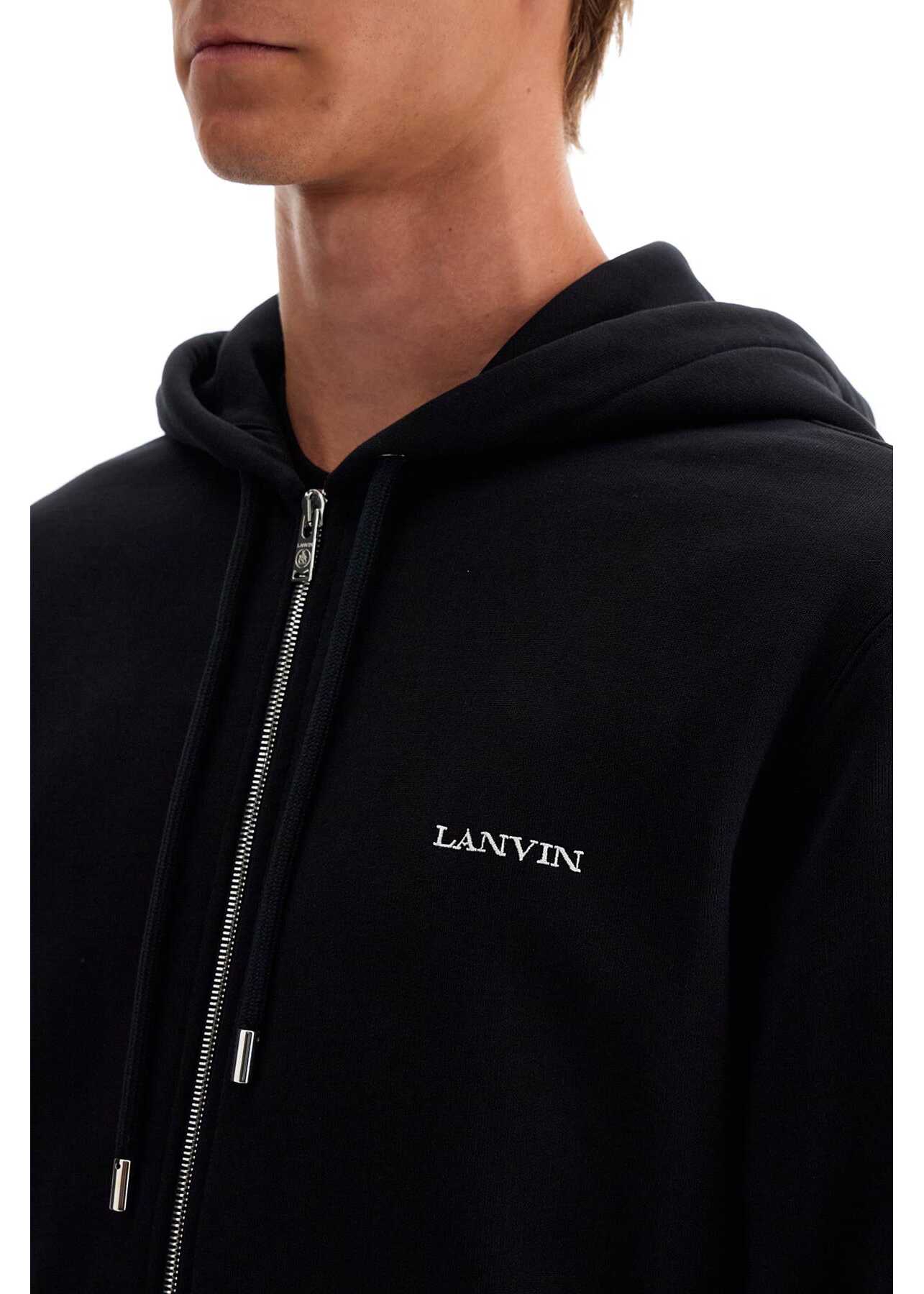 The Lanvin sweatshirt in brushed cotton jersey features an adjustable hood and a double-slider zip. Embellished with a printed fabric application on the back, it has a divided kangaroo pocket, ribbed cuffs and hem, and an embroidered logo on the chest. Relaxed fit. The model is 187 cm tall and wears size L.