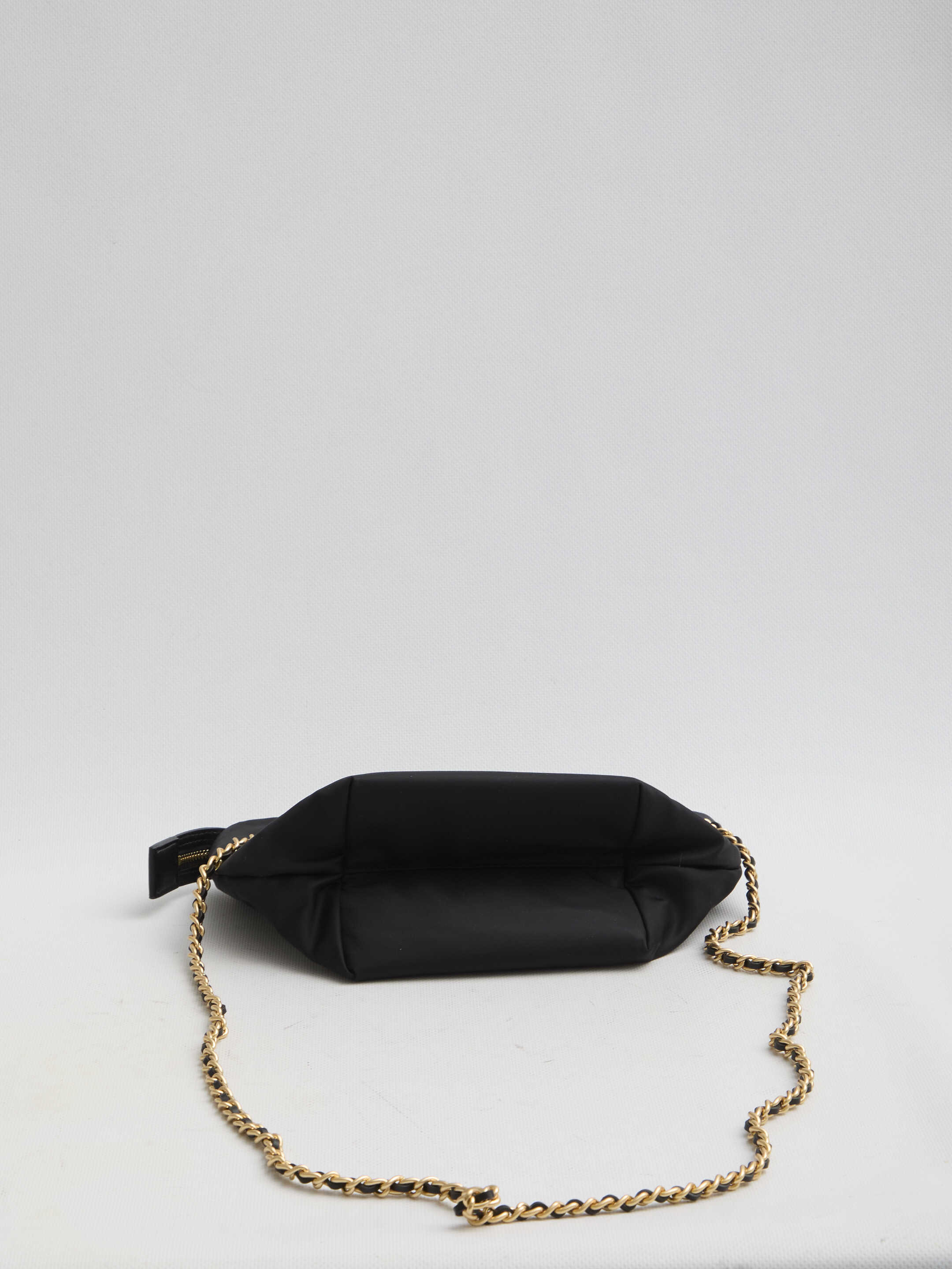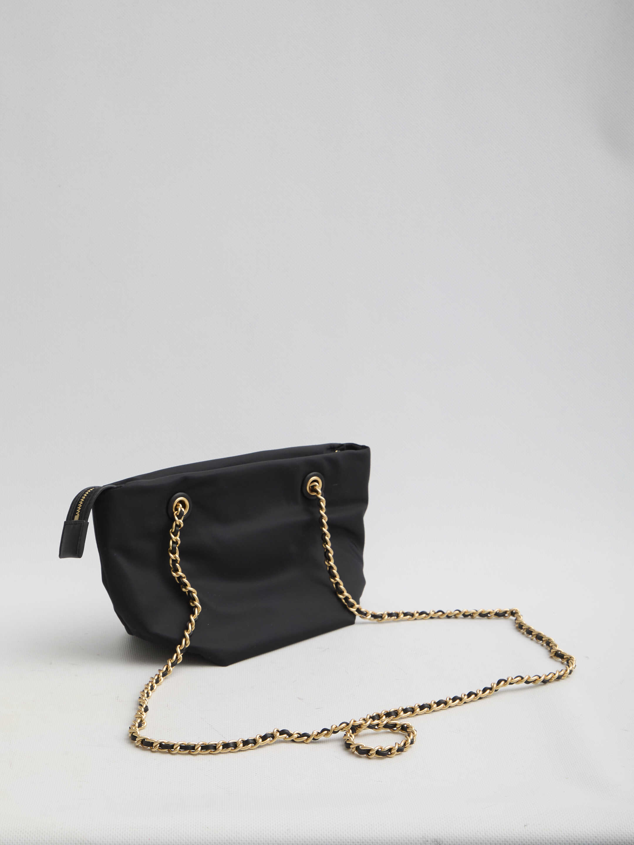 Ella small crossbody bag in black nylon with embossed leather Double T logo on the front. It features chain shoulder strap, zip closure, one main interior compartment and one interior card slot.