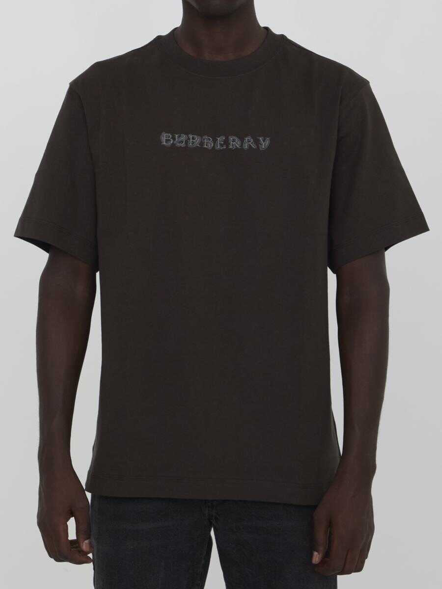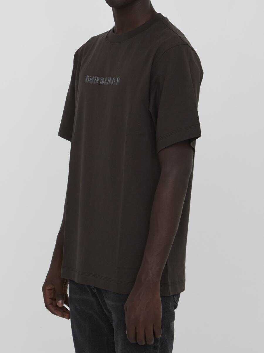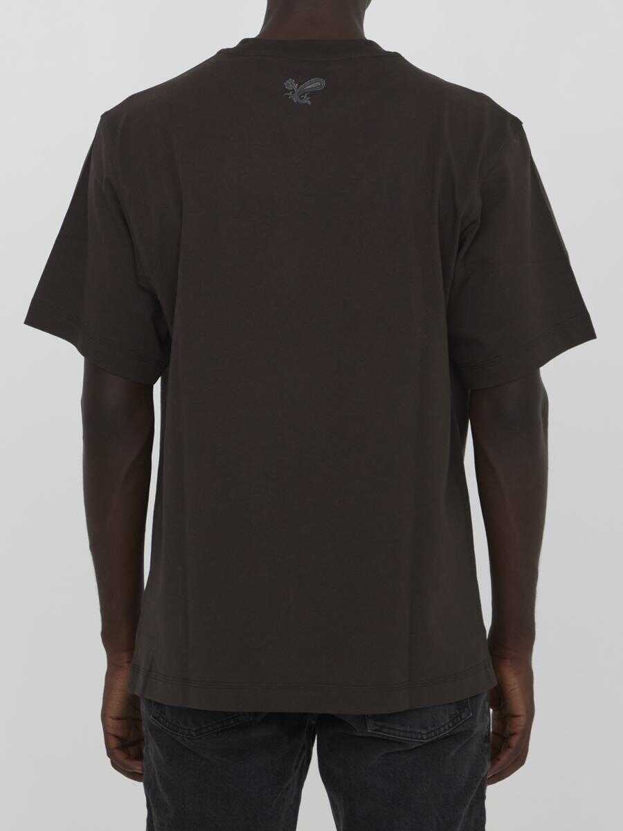 Short-sleeved crewneck t-shirt in brown cotton jersey with graphic print on the front and on the back of the neck. Ribbed collar. Regular fit.