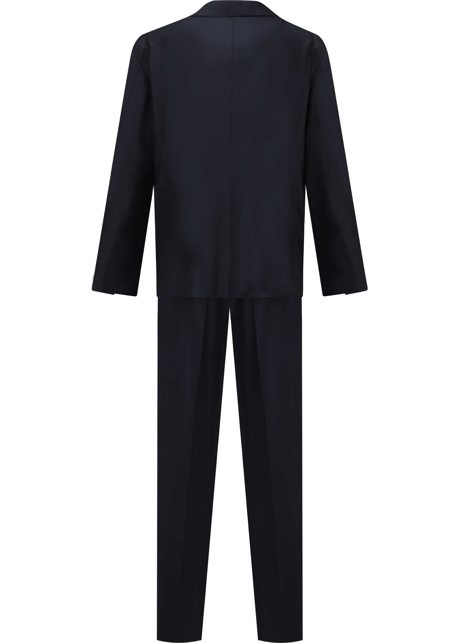 Virgin Wool Complete Suit by Tagliatore, consisting of jacket and pants. Virgin wool blazer jacket, front closure with matching buttons, two welt pockets on the front, one slit pocket on the front, peaked lapels, iconic brand logo applied on the lapels. Virgin wool classic pants, front zipper and hook-and-eye closure, two side slash pockets, two welt pockets on the back, belt loops waistband.