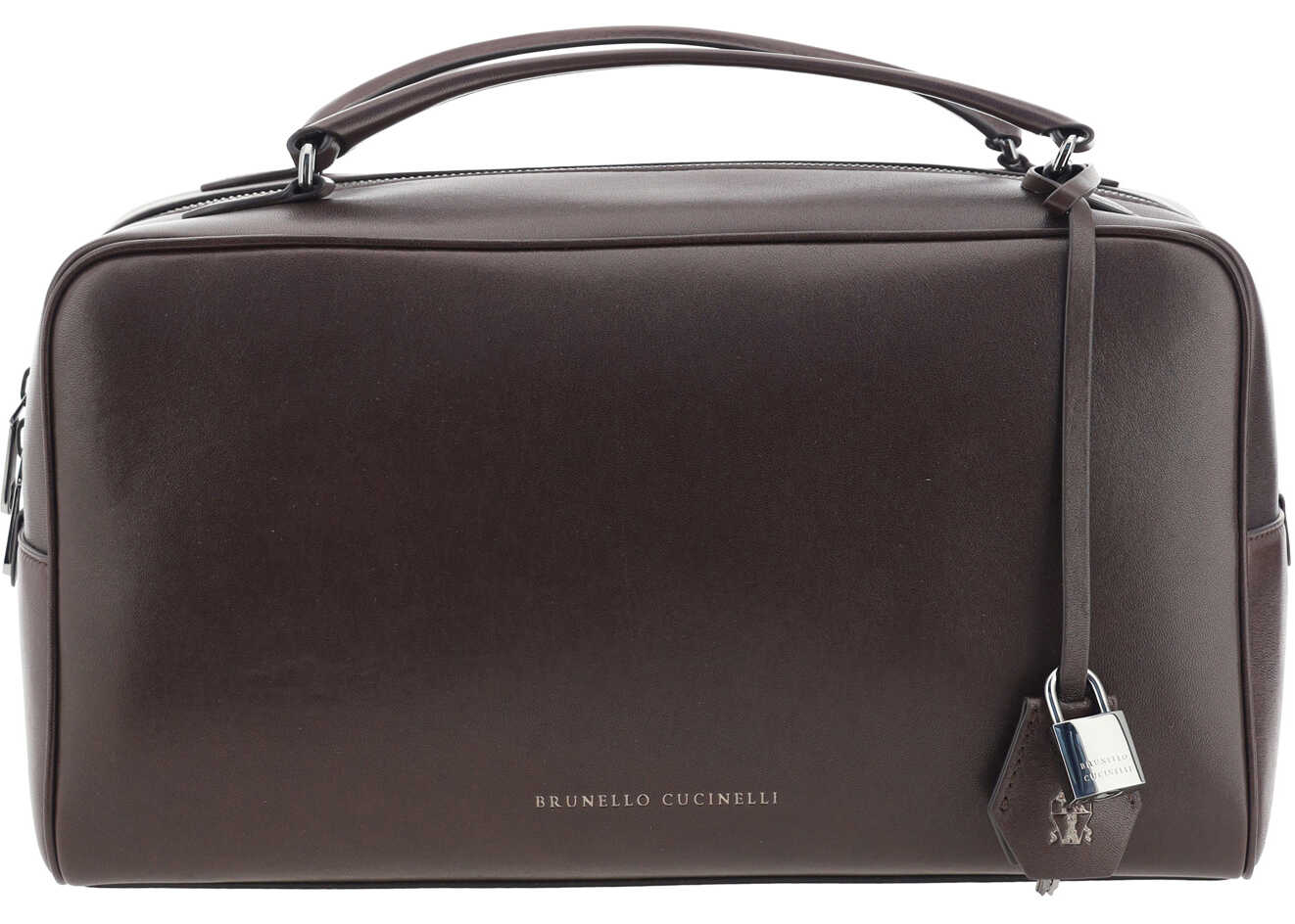 Calfskin Handbag by Brunello Cucinelli, smooth grain, front logo press-stamping, padlock detail, contrasting riveted hem, two round handles, adjustable and removable shoulder strap, top zipper closure, gusseted pockets at sides, single interior compartment.