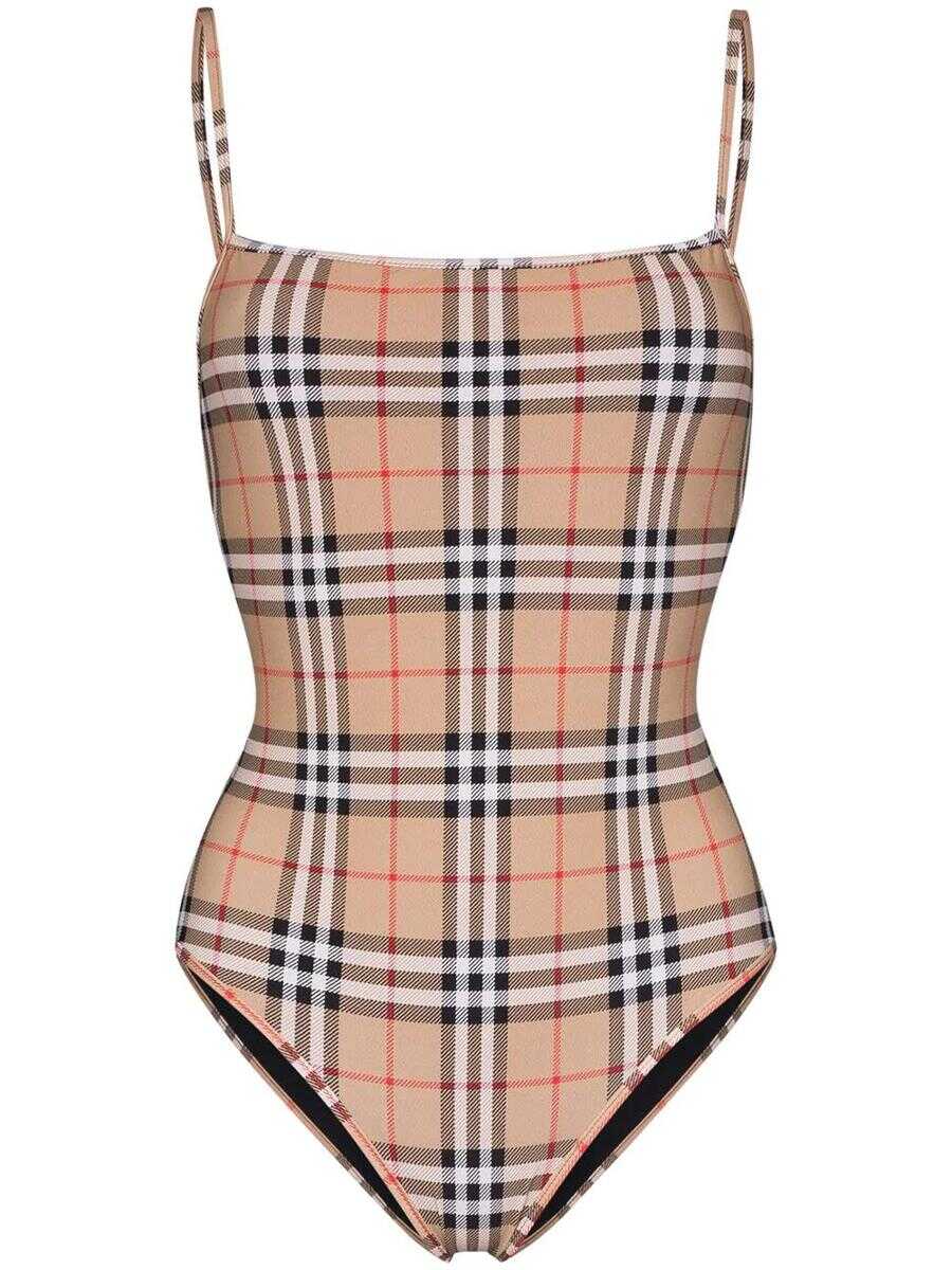 This neutral Burberry Vintage check swimsuit is crafted in Portugal from quick-dry stretch fabric. Fully lined, it provides medium coverage and has slim shoulder straps, a straight neckline and low back. This Burberry swimsuit just opened with a Queen's Gambit and secured a checkmate against the rest of our swimwear collection.