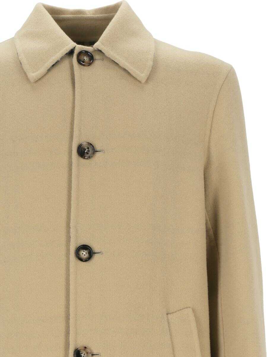 sand beige wool classic collar two side welt pockets checked lining front button fastening central rear vent
