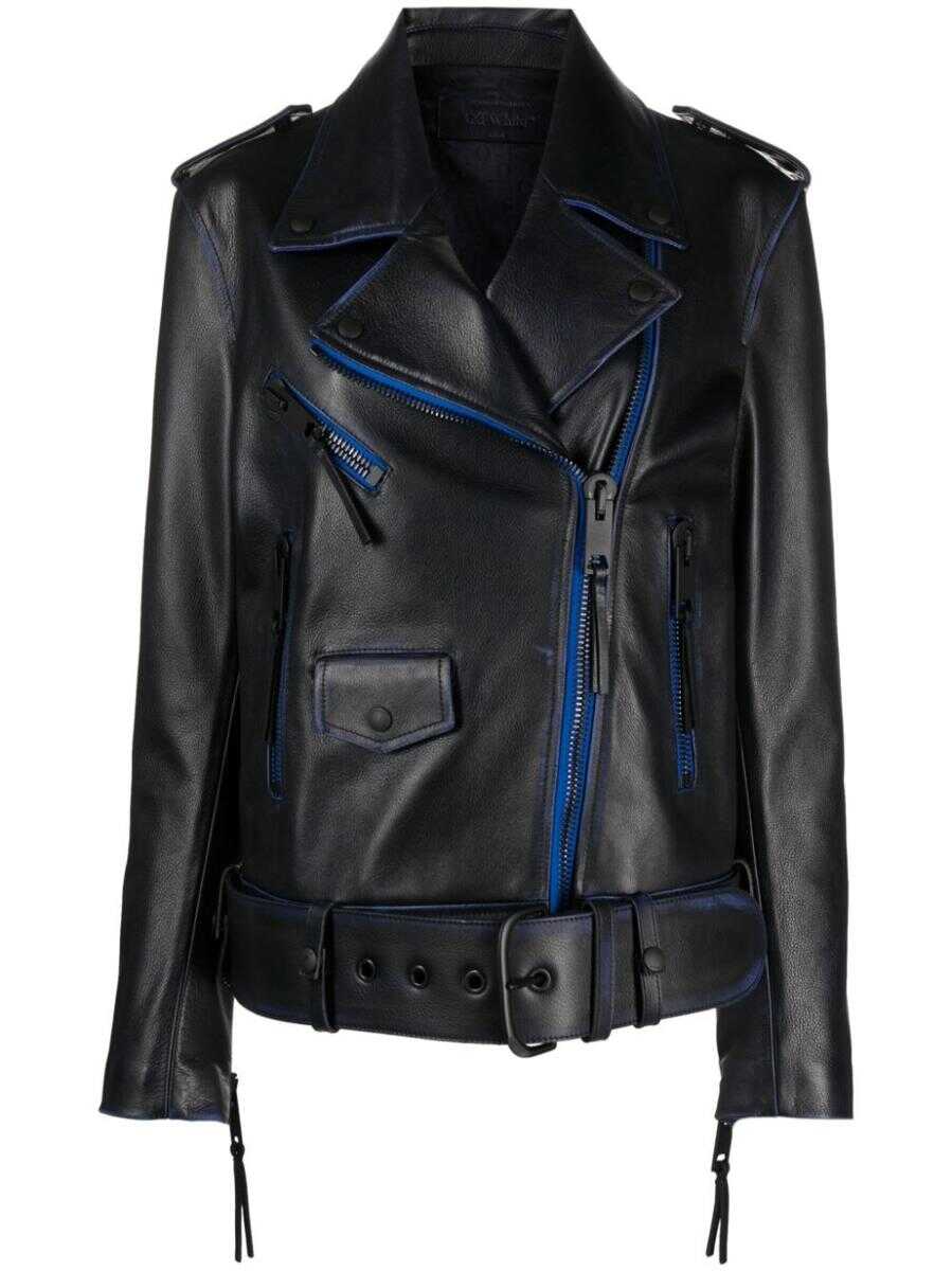 Constructed in a biker silhouette, this Off-White jacket is crafted from smooth black leather. A bold cobalt blue trim elevates the edgy design, complete with a belted hem.