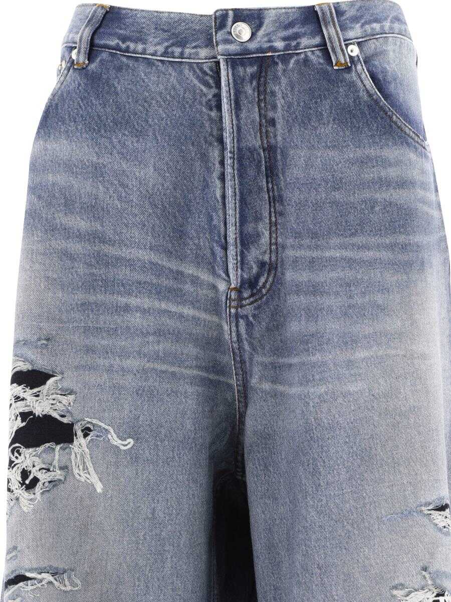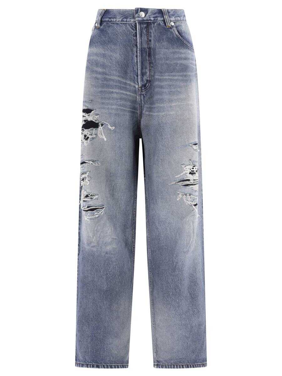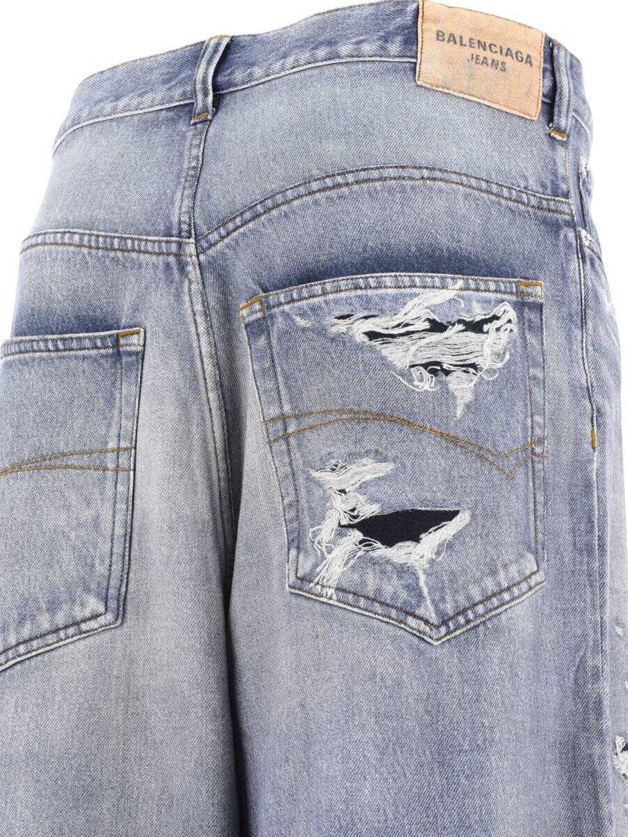 Balenciaga’s Trompe l'Oeil blue denim oversized jeans featuring belt loops, button and zip fly, five pocket cut, wide leg with rips and logo print inserts and back logo label.