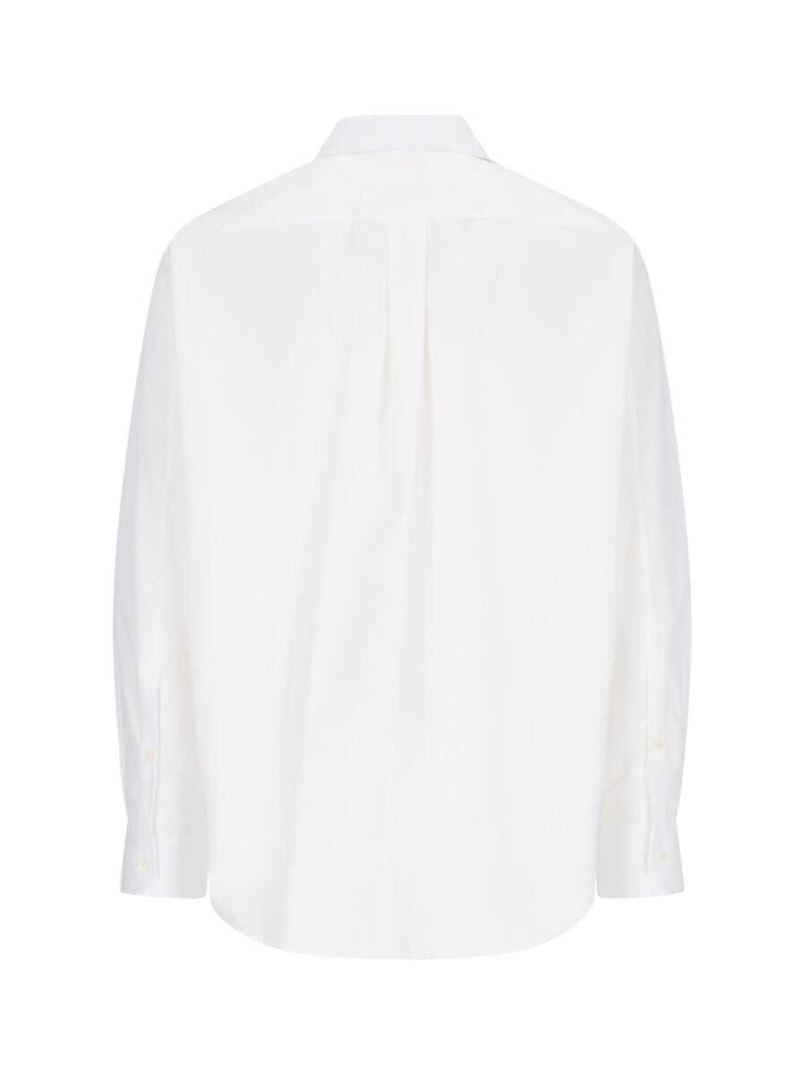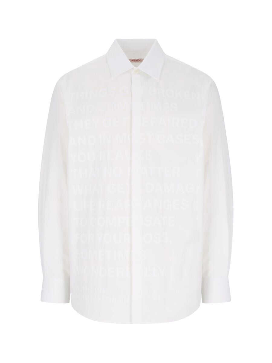 White cotton poplin texture slogan print to the front classic collar long sleeves buttoned cuffs box-pleat detail straight hem LENGTH: 140.0 Centimetres WIDTH: 140.0 Centimetres