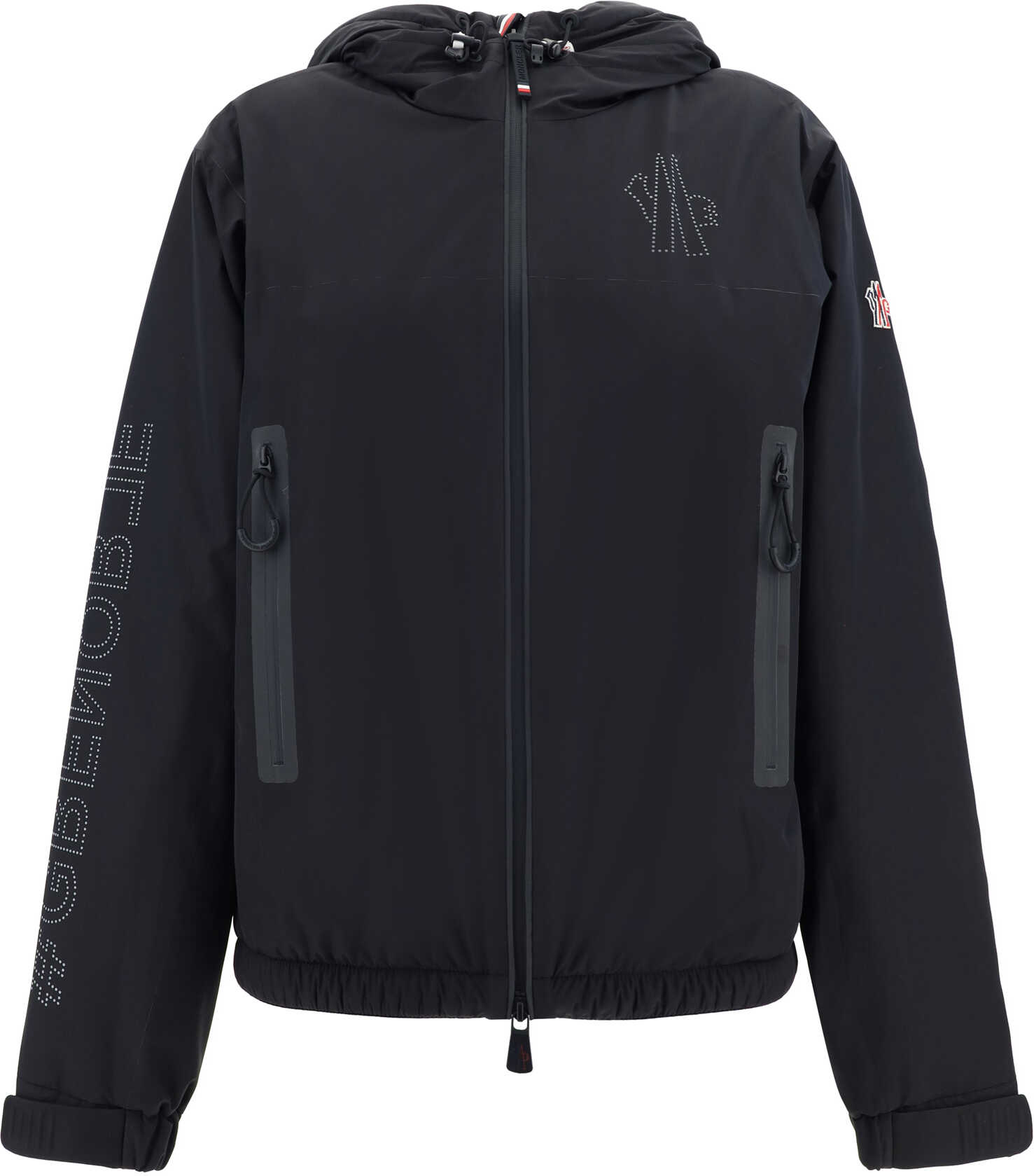 Fanes Jacket by Moncler Grenoble, hooded high-neck design, drawstring-adjustable hood, two-slider front zipper closure, two side zipper welt pockets, adjustable mendiate drawstring waist, elastic cuffs, iconic brand monogram cut-out detail on right front and back sleeve, iconic brand monogram patch embroidered on left sleeve, monochrome pattern, regular fit.