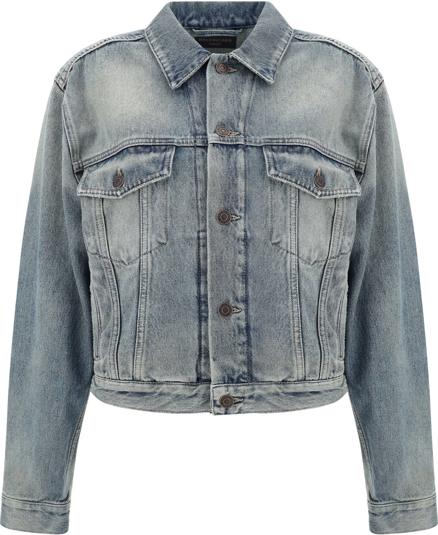Cotton Denim Jacket by Balenciaga, classic collar, front button closure, two side welt pockets, two front patch flap pockets, monochrome pattern, regular fit.