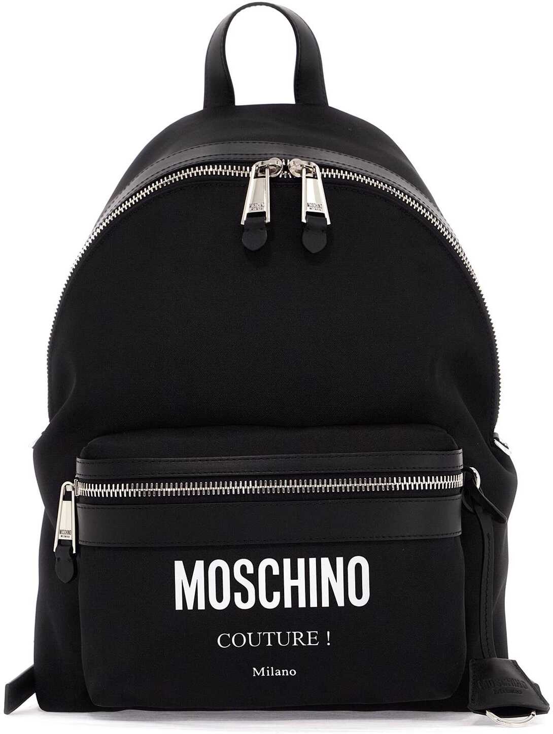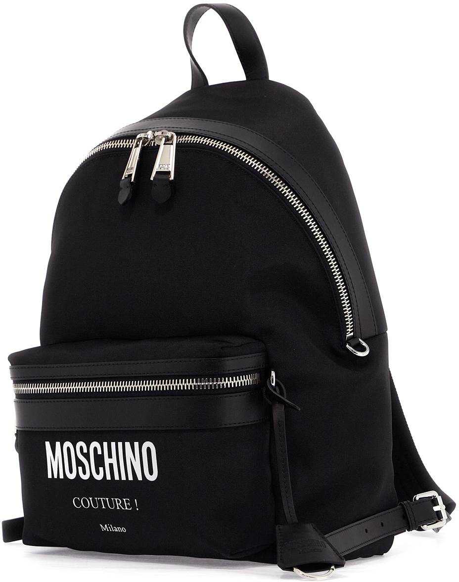 This Moschino backpack is made of nylon with contrasting logo lettering printed on the front pocket. The main compartment has a two-way zip closure, and the interior is lined with two open pockets, one with a zip and one with a credit card slot. The back is padded, and the shoulder straps are adjustable. The metallic accessories have a silver finish.