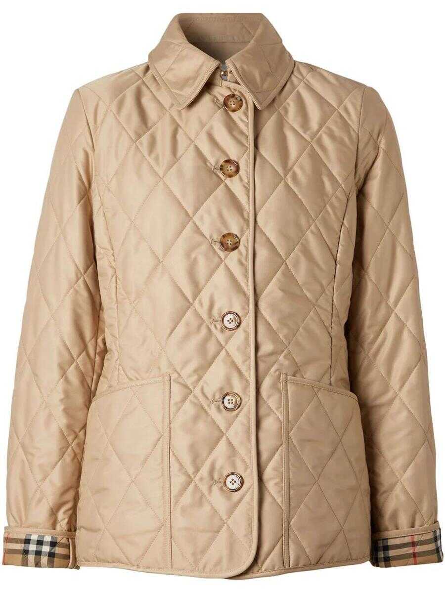 In a diamond-quilted construction, this beige jacket from Burberry offers warmth and a timeless aesthetic. The button-up design is topped with a neat collar for a refined finish.
