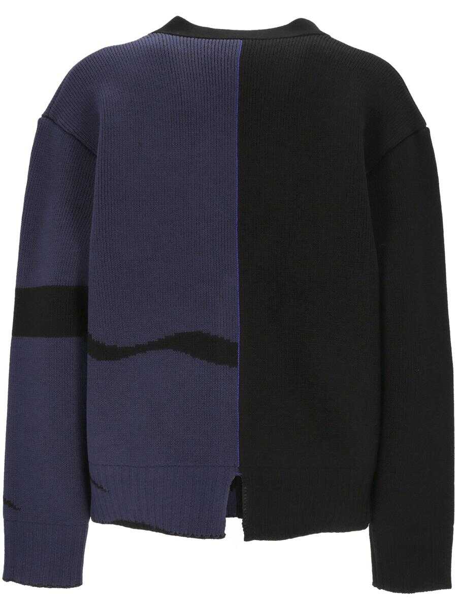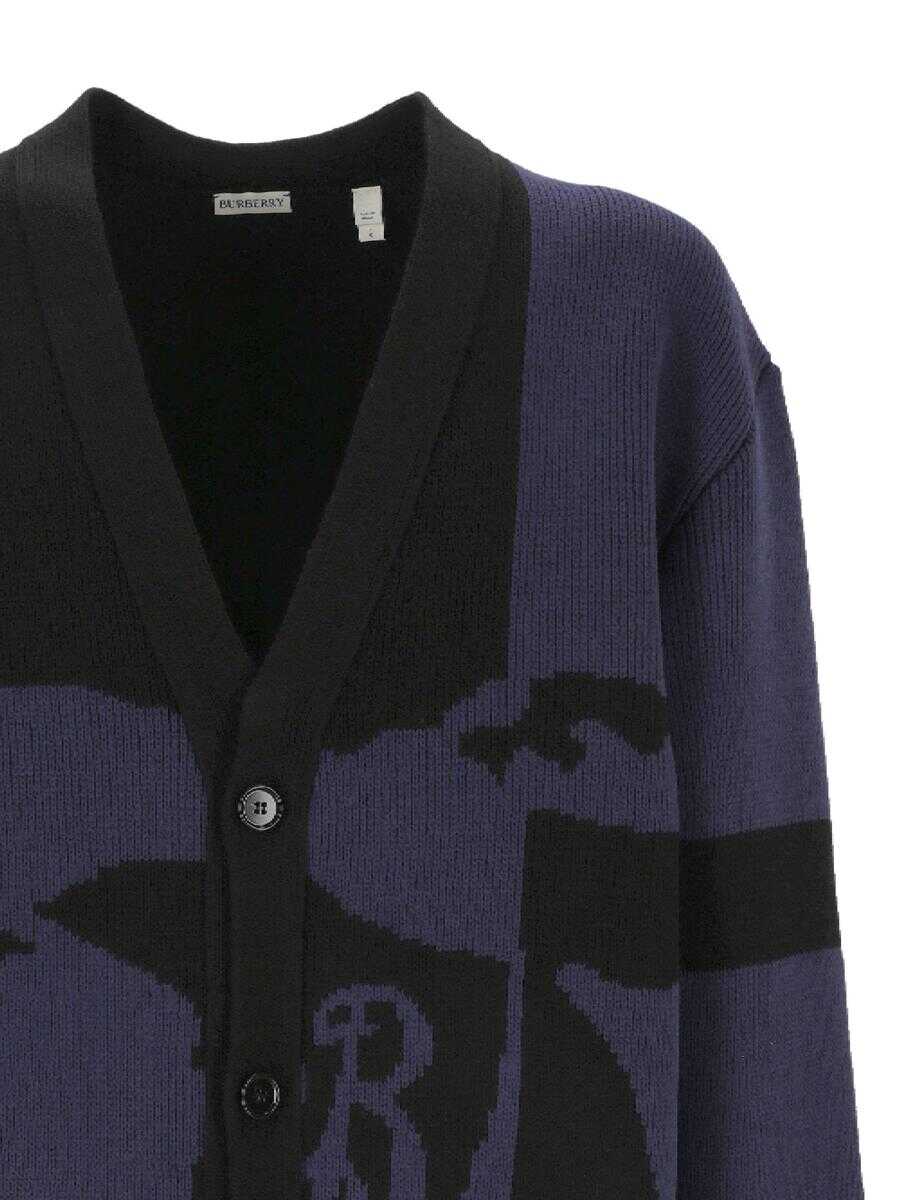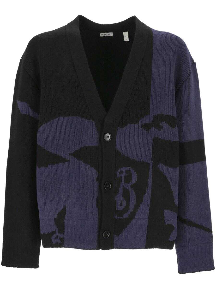 black/navy blue wool ribbed knit signature Equestrian Knight jacquard motif front button fastening V-neck long sleeves ribbed cuffs rear slit straight hem