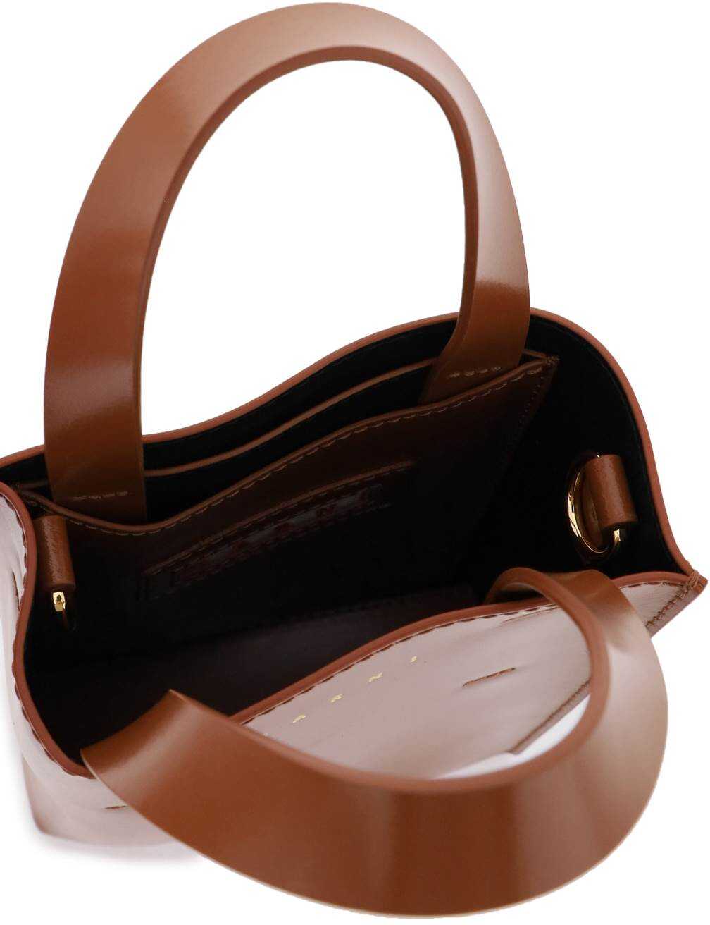 Nano Museo tote bag by Marni crafted in smooth leather featuring gold-tone lettering logo print at front. Contrasting leather-lined interior with one patch pocket, double handles, adjustable and detachable shoulder strap in logoed fabric. Gold-tone metalware.