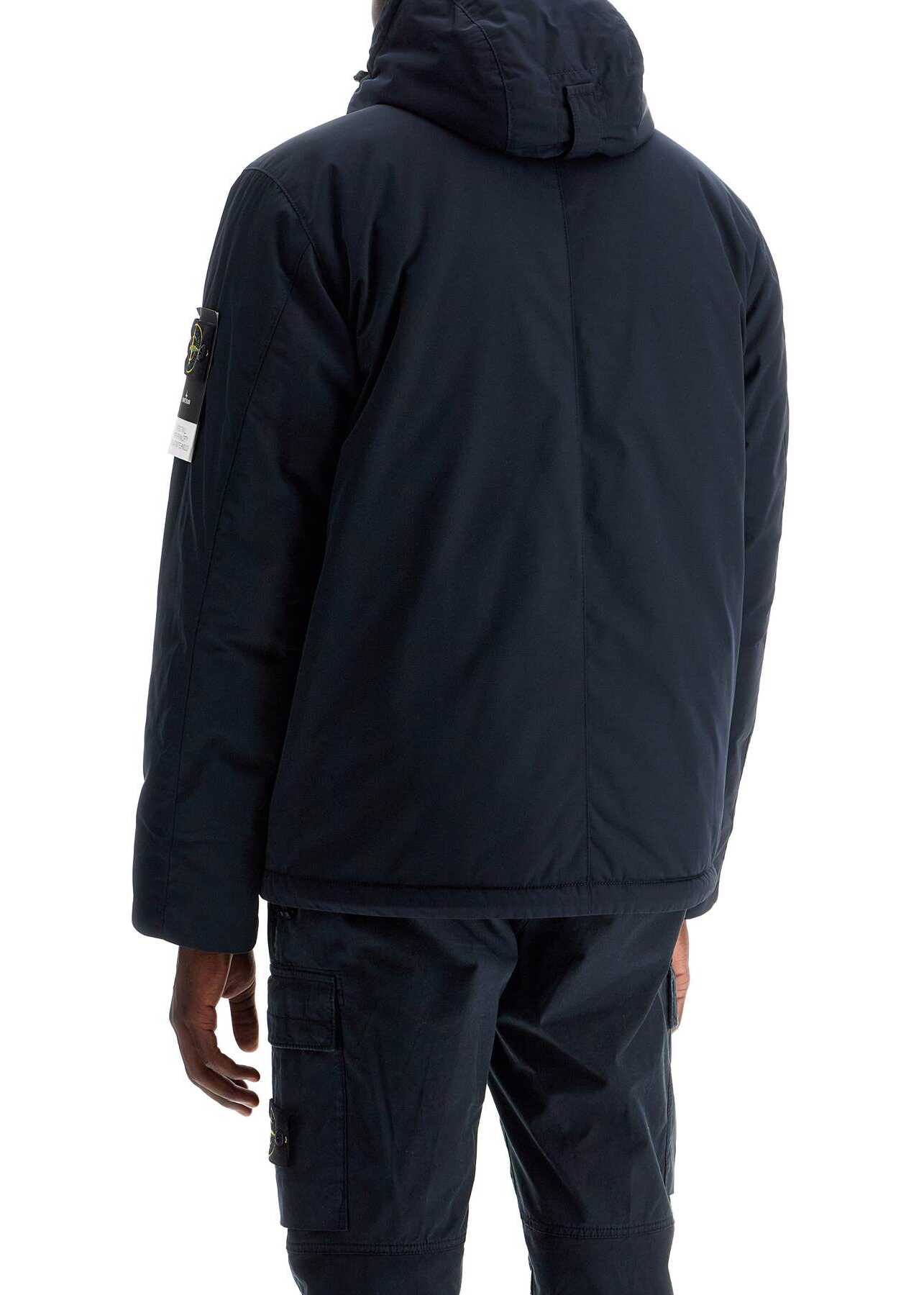 The Stone Island hooded jacket is made of water-repellent Micro Twill and padded with a layer of 100% recycled PRIMALOFT Gold P.U.R.E. fibers. It features a two-way zip and snap button closure, side pockets with zips, ribbed inner cuffs, a drawstring hood and hem, and an internal pocket. The fit is regular. The model is 187 cm tall and wears size L.
