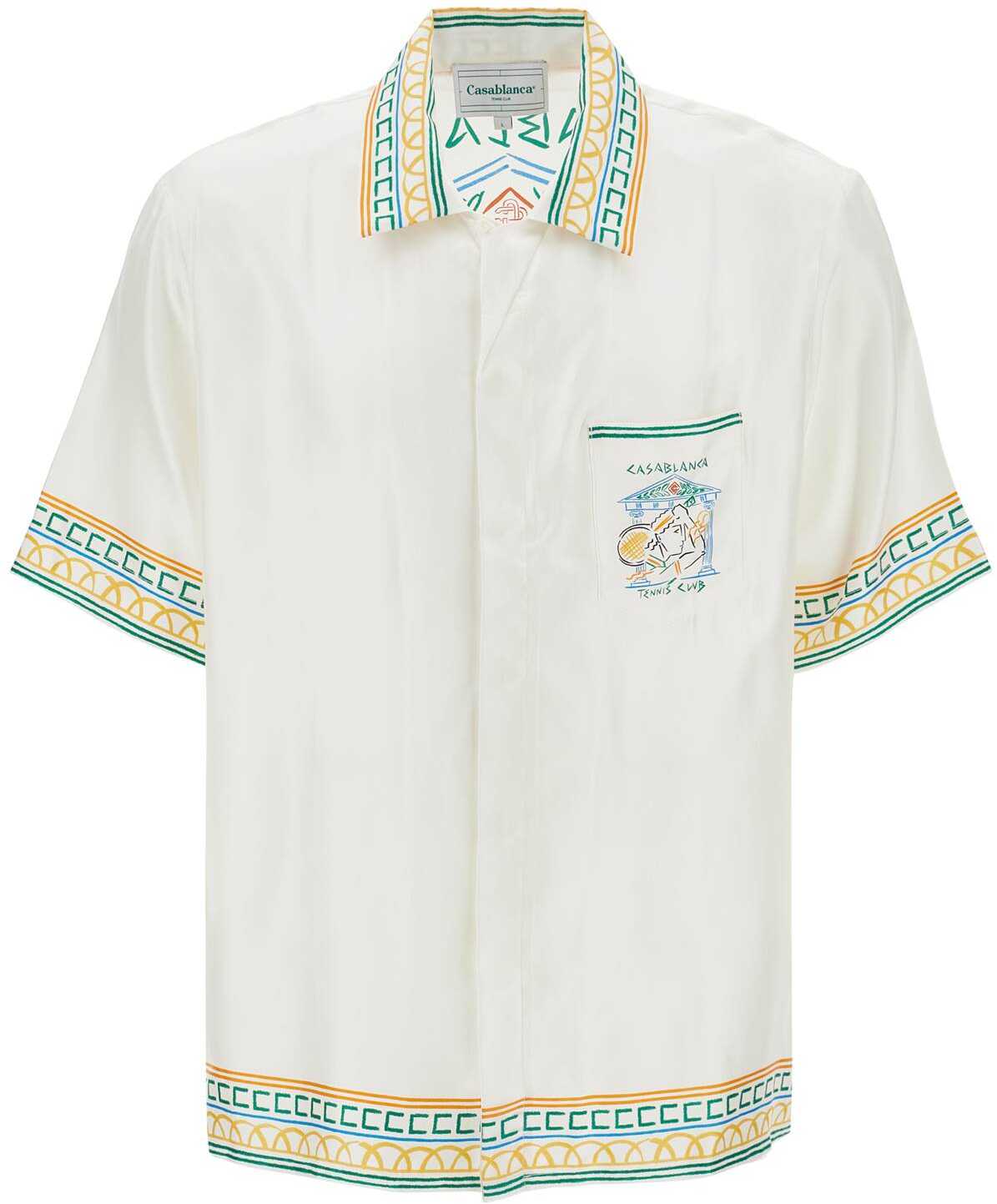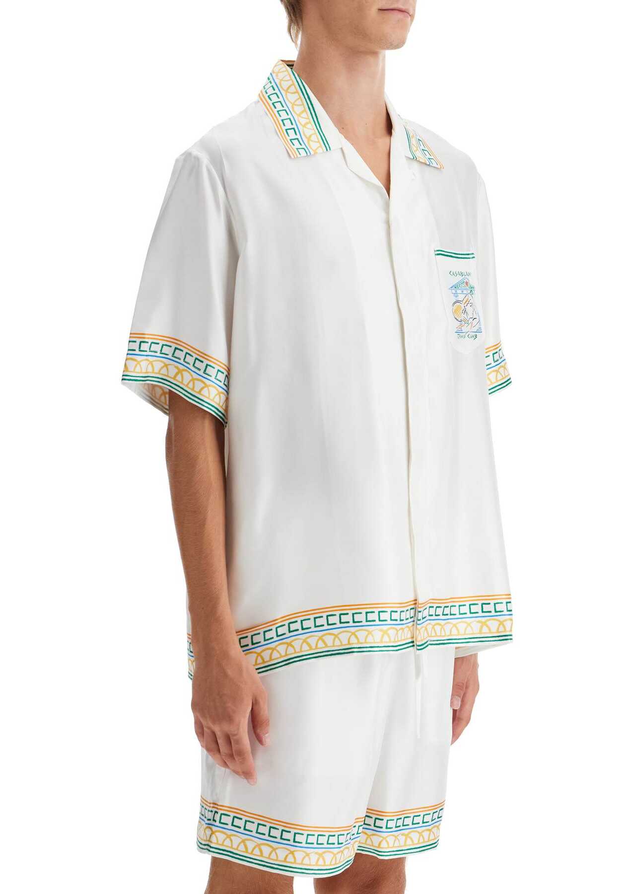 The Casablanca short-sleeved shirt is made of monogram silk jacquard with "Crayon Temple Tennis Club" pattern prints. It has a relaxed fit with a boxy cut, Cuban collar, chest pocket, and hidden button closure. The model is 187 cm tall and wears size L.