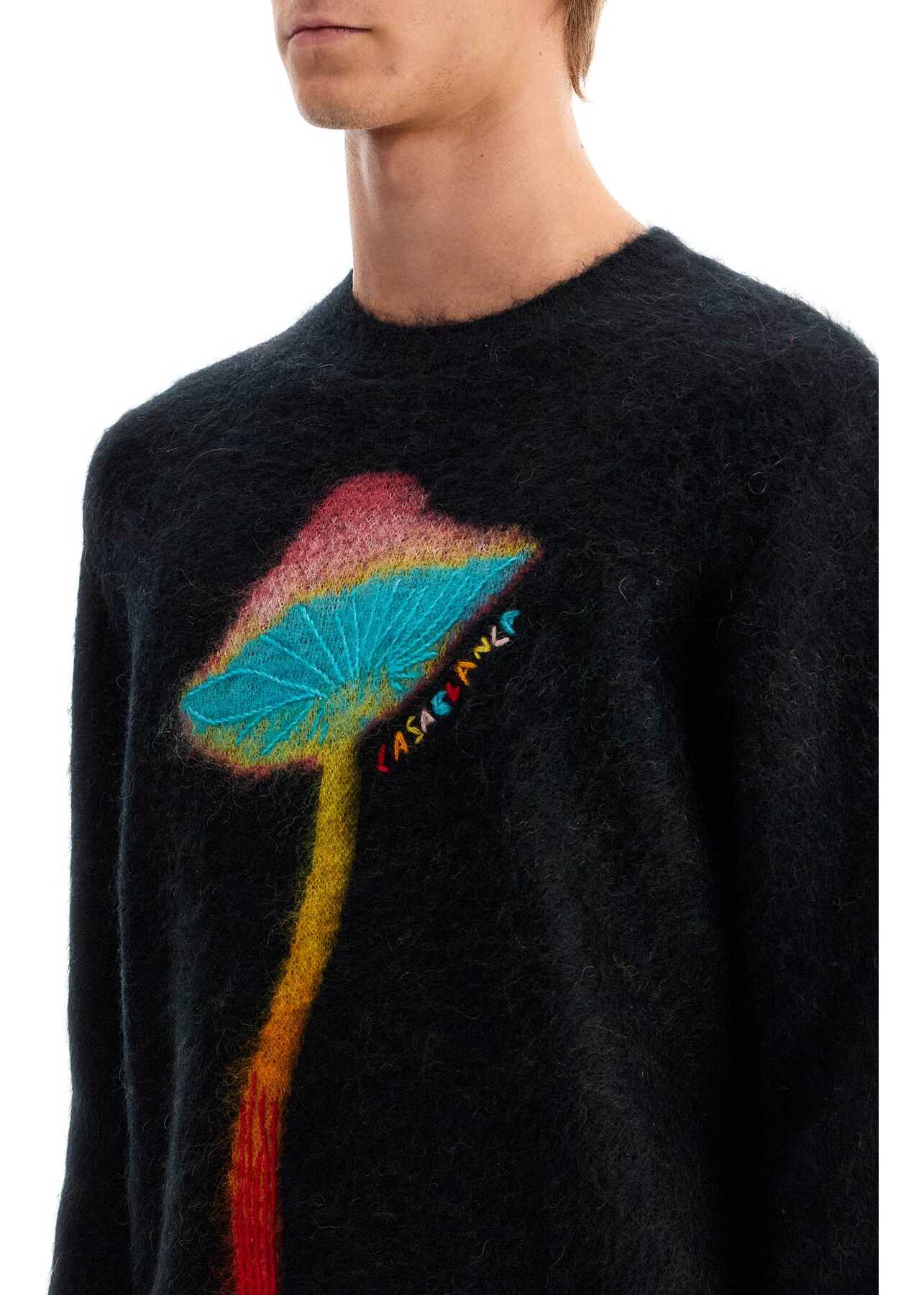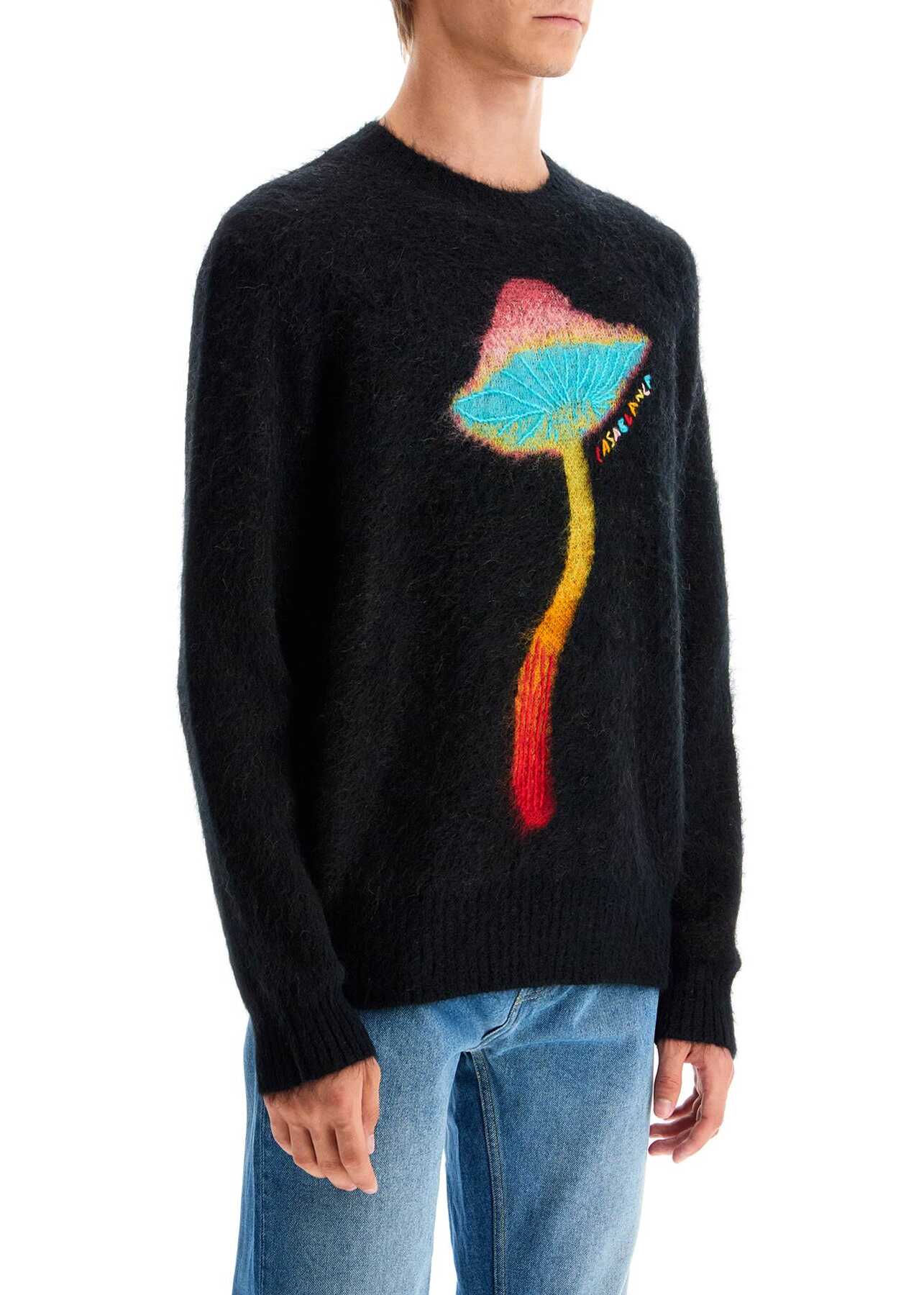The Casablanca crewneck sweater is made of soft mohair blend and decorated with a psychedelic Rainbow Mushroom graphic print, paired with the embroidered multicolored logo lettering. Ribbed edges, relaxed fit. The model is 187 cm tall and wears size L.