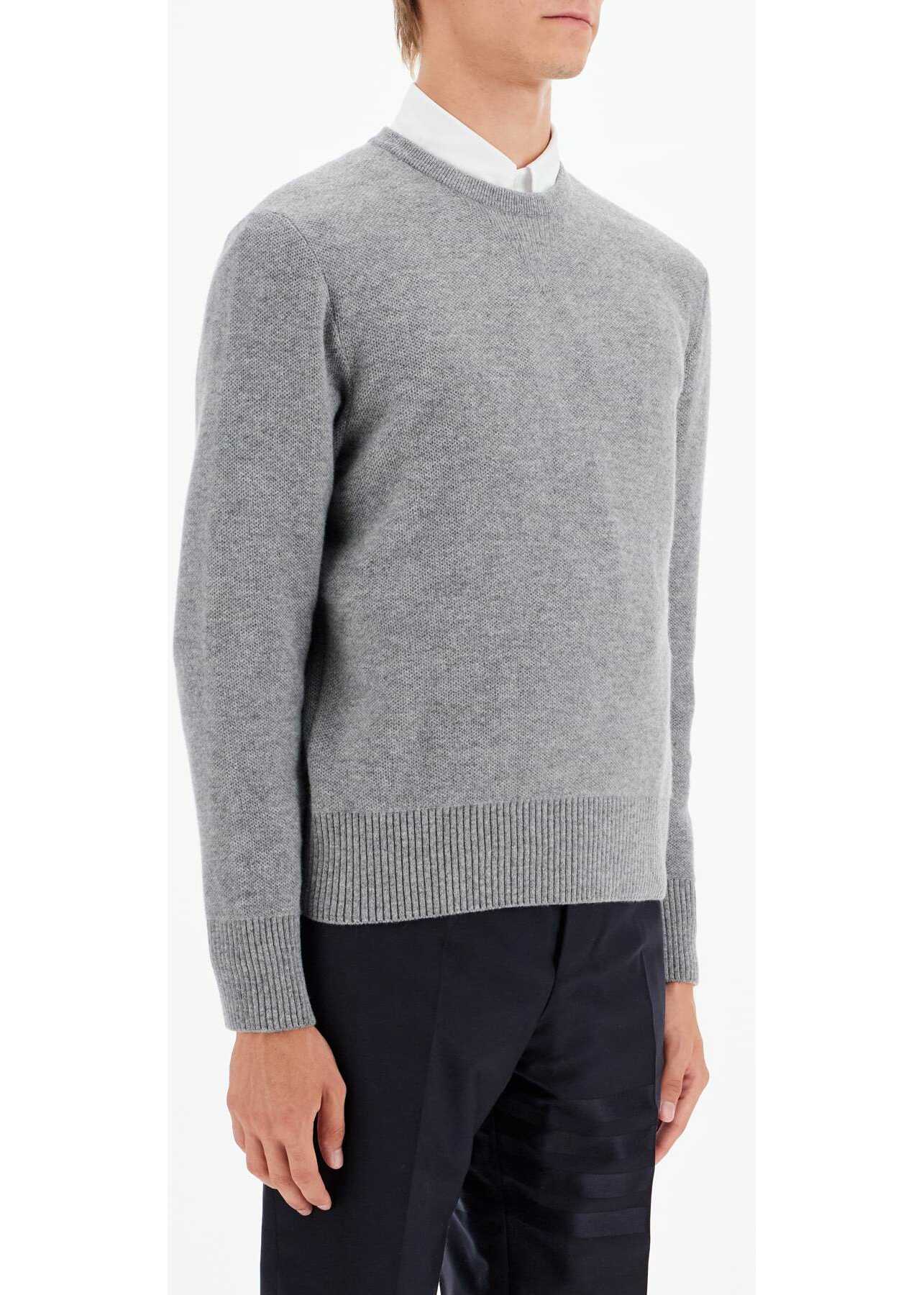 This Thom Browne crewneck pullover is made of virgin wool piqué with a tricolor back band, ribbed edges, and an iconic grosgrain tab on the back of the neck. It has a relaxed fit and the model is 187 cm tall and wears size 3 Thom Browne.
