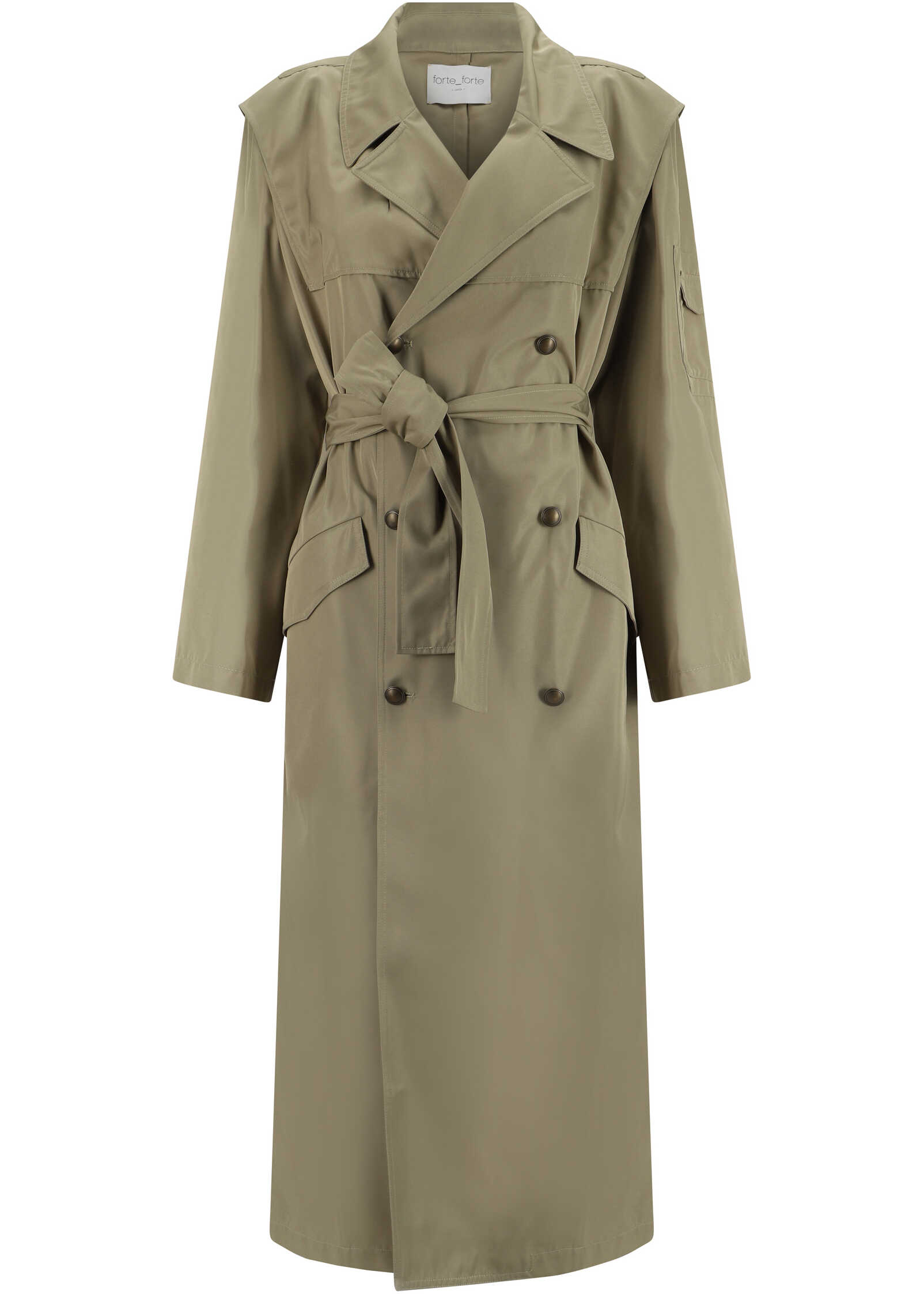 Cotton Trench Jacket by Forte_Forte, classic lapels, front button closure, two side flap welt pockets, back slit, flap patch pocket on left belly, matching knotted sash waistband, monochrome pattern, regular fit.