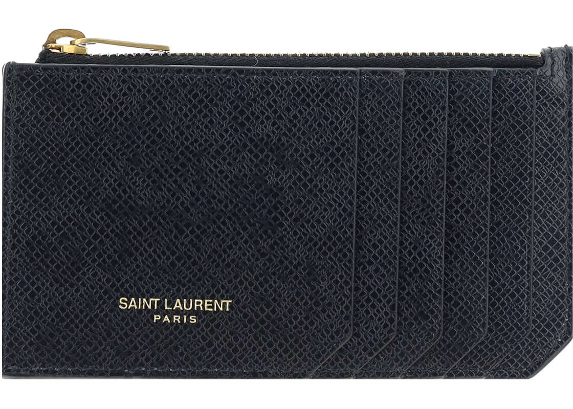 Calfskin Card Hoder by Saint Laurent, card slots on front, zippered pocket at top, contrasting logo on front.