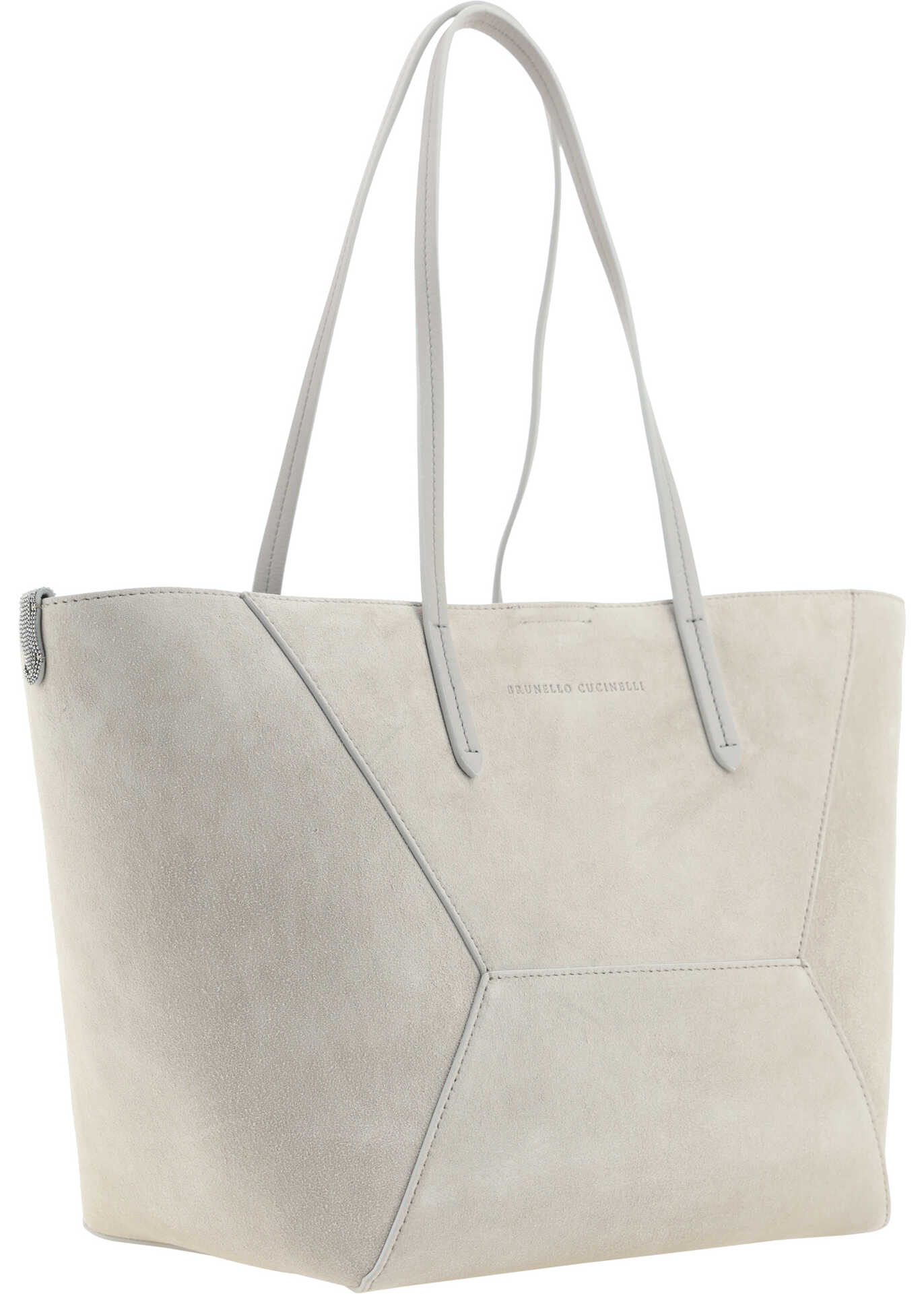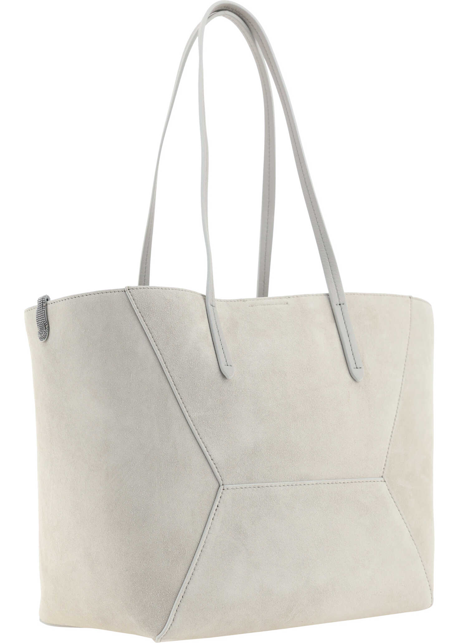 Leather Shoulder Bag by Brunello Cucinelli, two flat leather handles, magnetic button closure at top, paneled design with embossed stitching, single interior compartment, shiny applique jewelry detail on side panels, removable pouch inside, suede design.