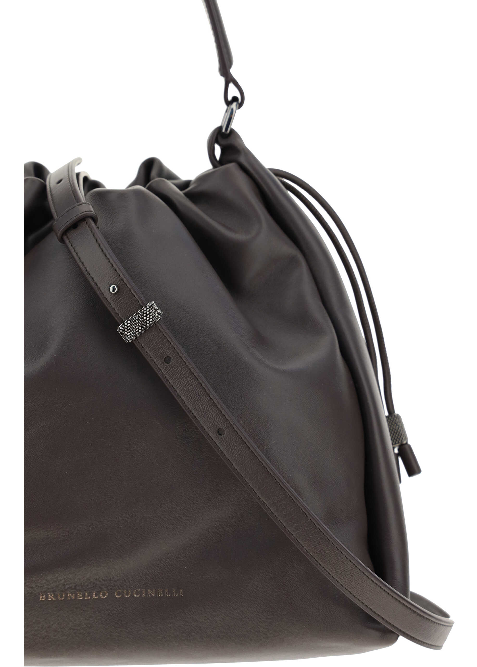 Leather Shoulder Bag by Brunello Cucinelli, top closure by drawstring, adjustable and removable flat handle at top, one compartment, iconic brand signature press-stamped on front.
