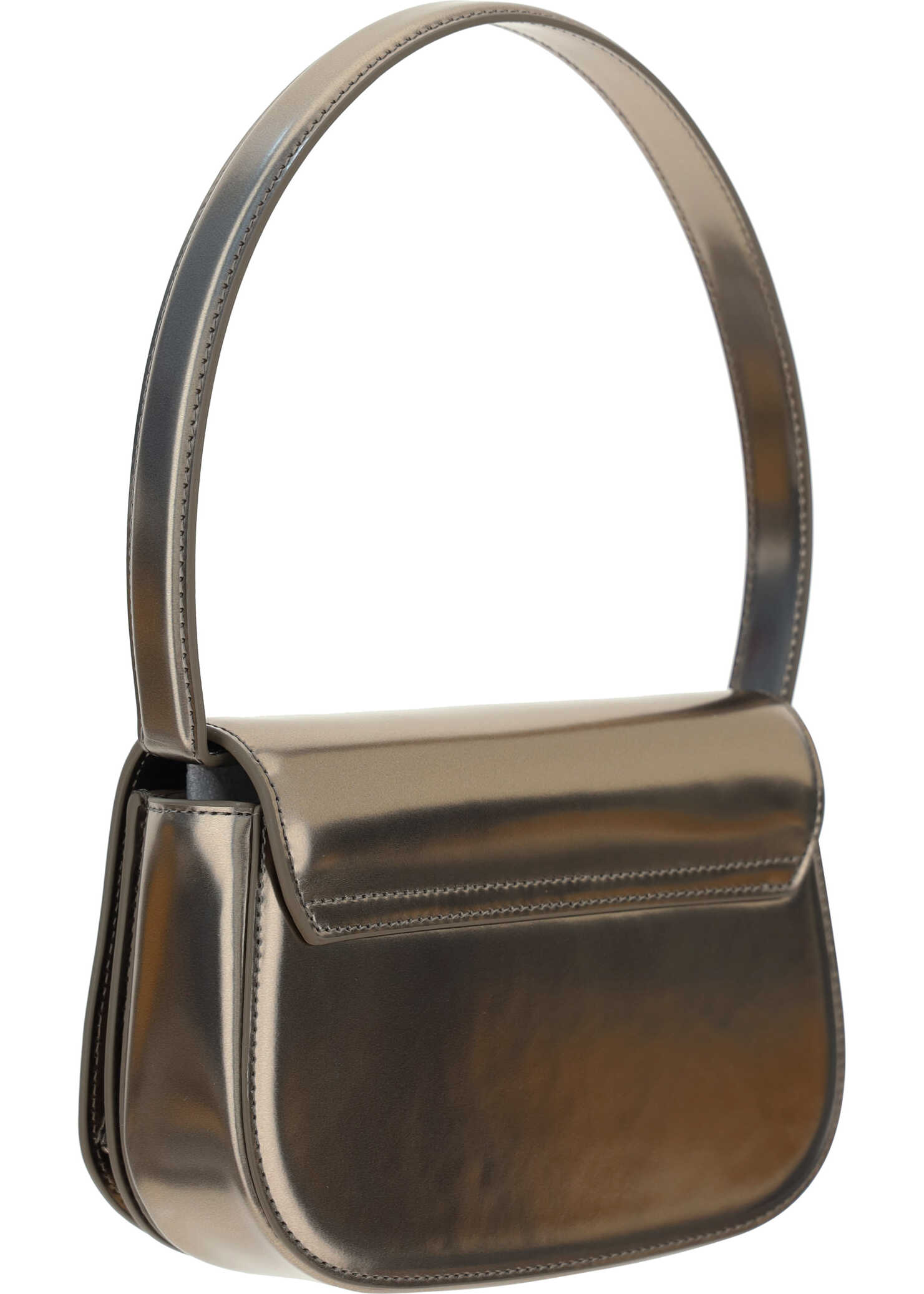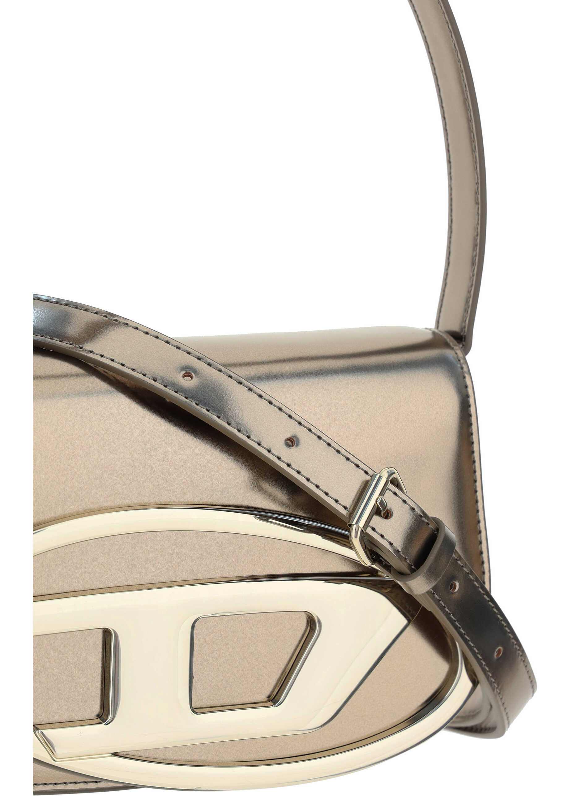 Calfskin Shoulder Bag by Diesel, mirrored leather design, flat shoulder strap, front closure with magnetic flap, iconic three-dimensional Oval-D brand logo on the front, inside welt pocket.