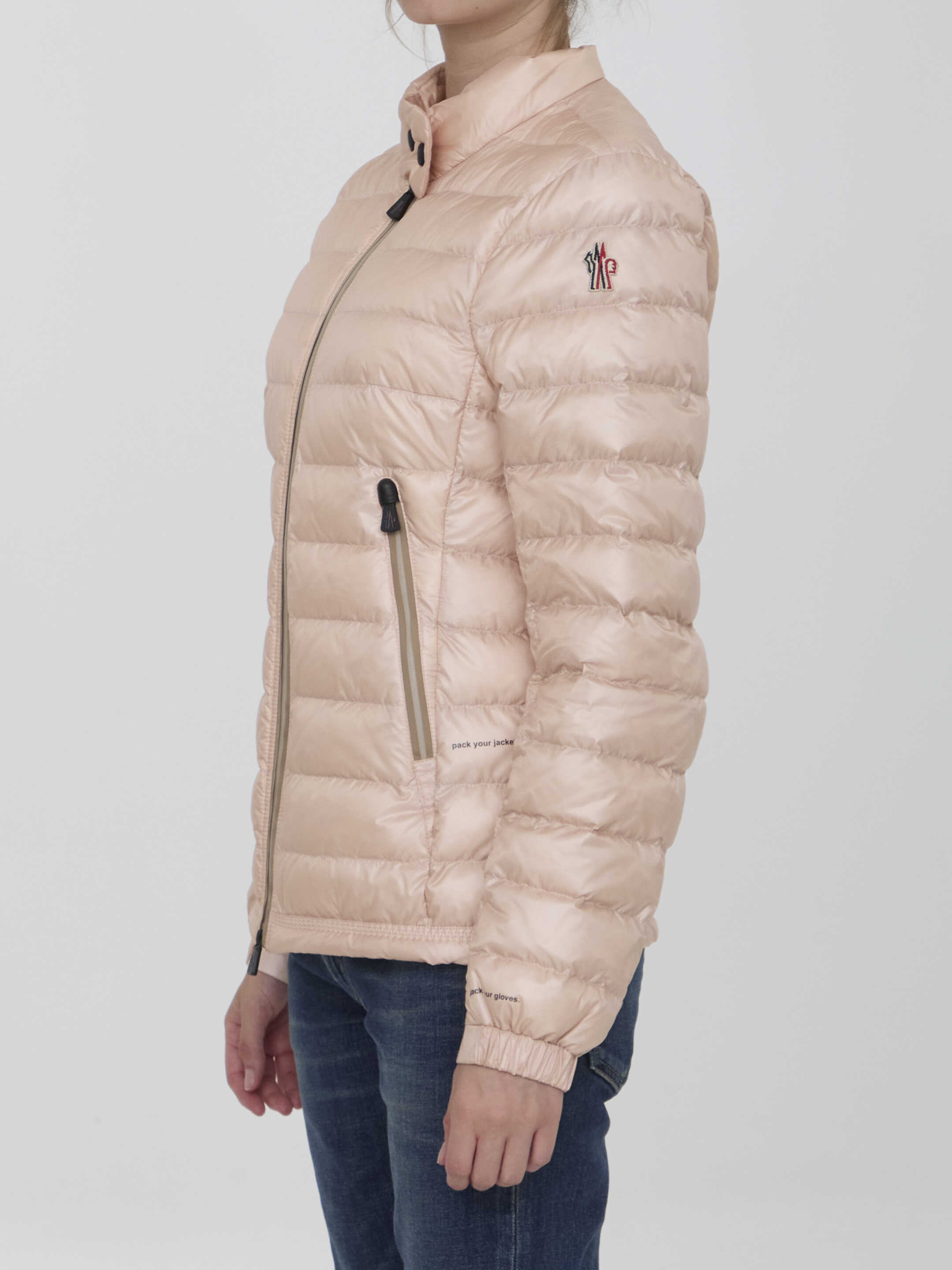 Walibi short down jacket in pink micro ripstop with nylon lining and down filling. It feature press-stud closure on collar, front two-way zip closure, two side zip pockets, branded details and pull-out gloves. Packable. Slim fit.