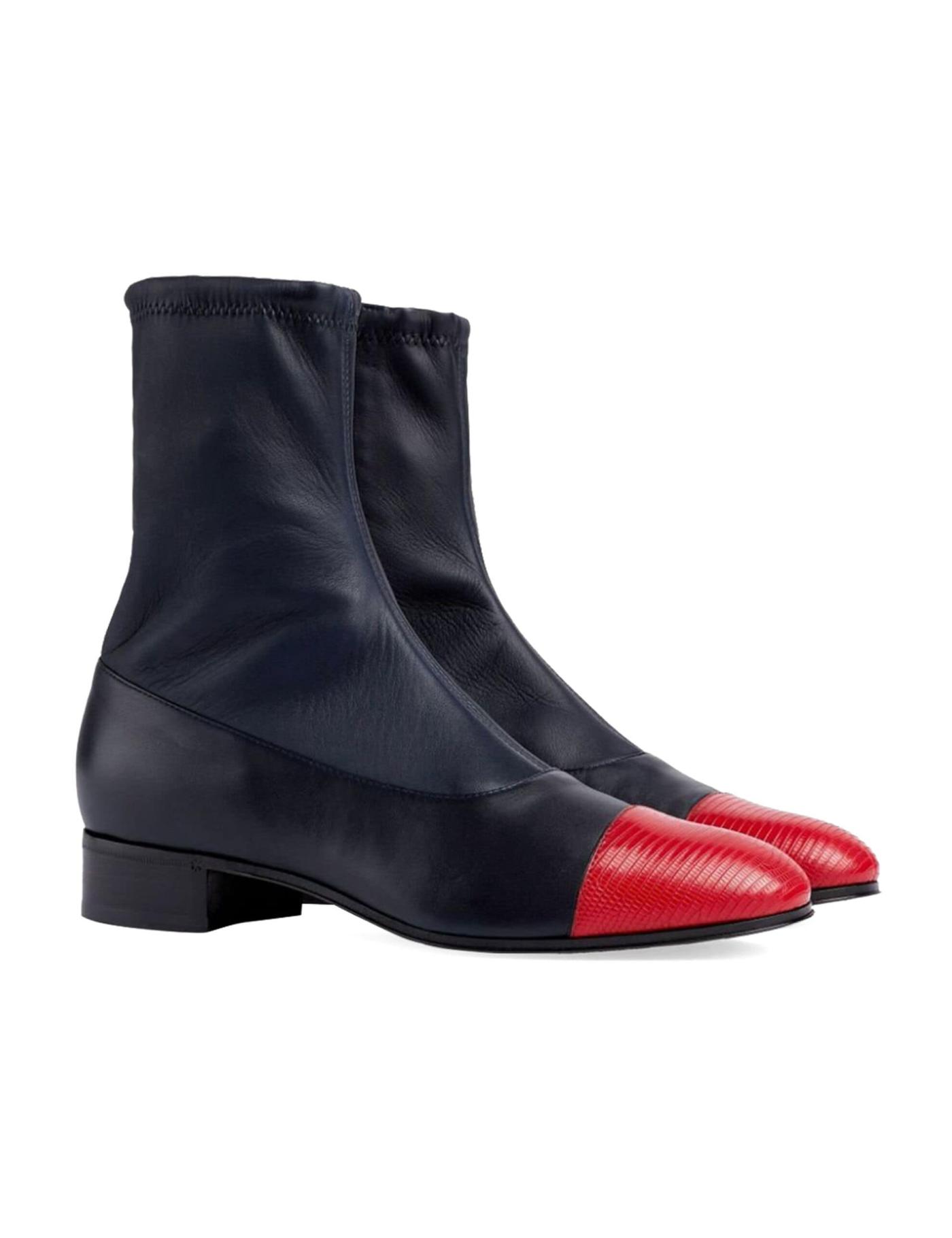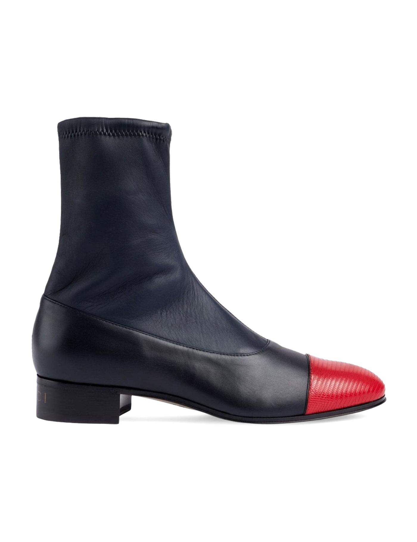 Classic silhouettes are reinterpreted through the modern lens for SS23 at Gucci, as evidenced by these black leather boots. They're elevated by contrast red lizard-effect detailing on the toe that nods to the label's penchant for unexpected finishing touches.