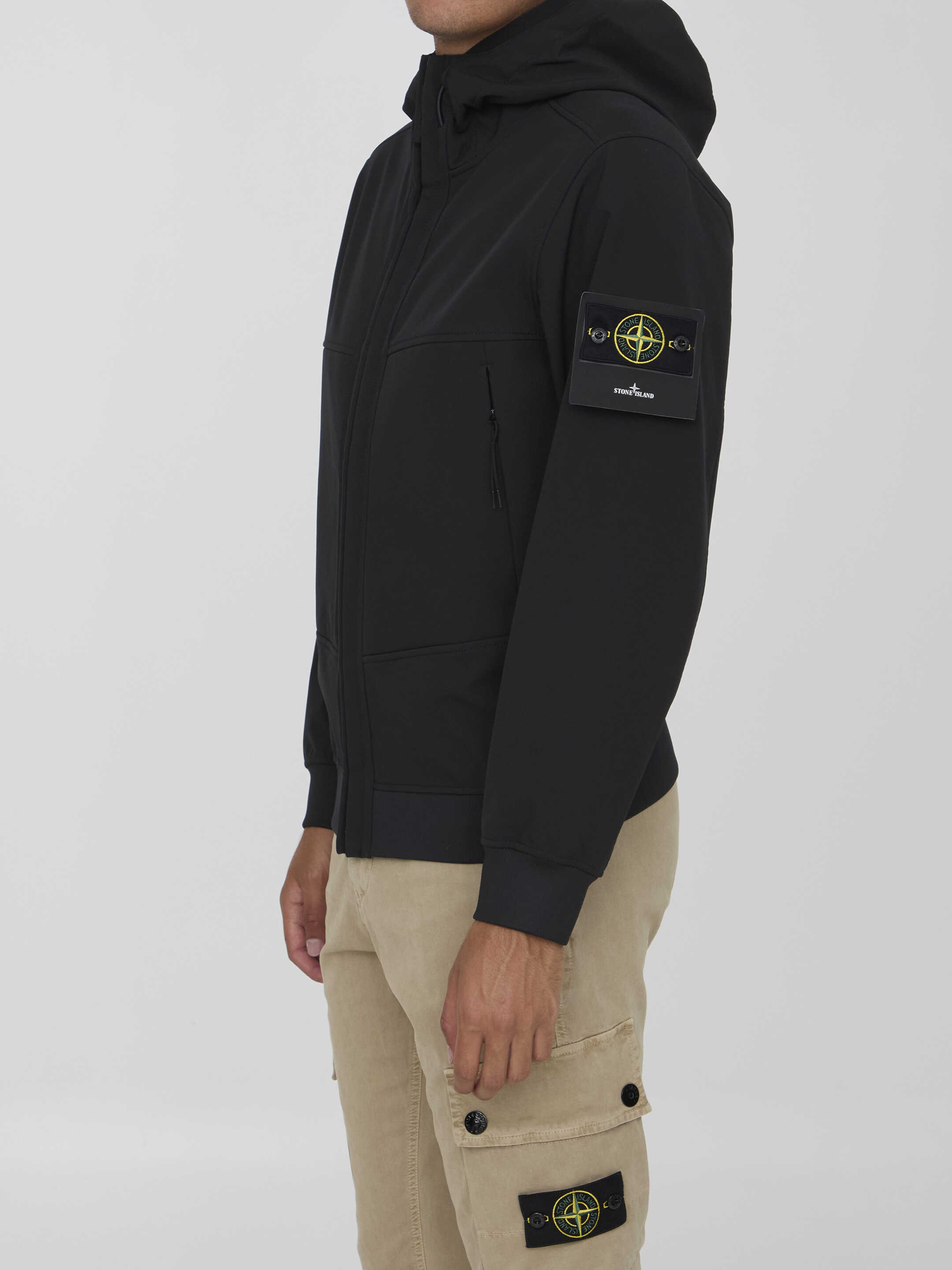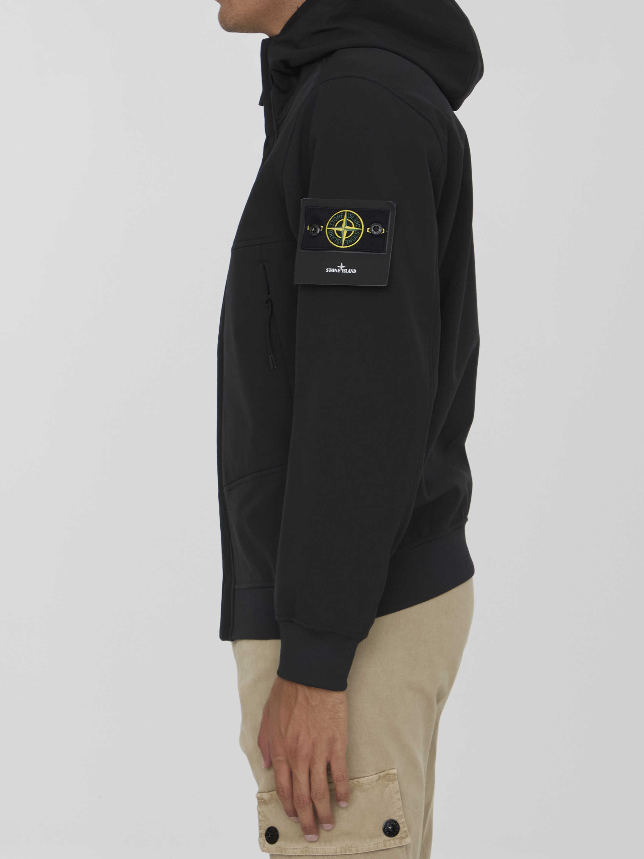 Soft Shell-R jacket in black recycled polyester with E-Dye technology. It features drawstring hood, front two-way zip closure, two side zip pockets, Compass patch on left sleeve and elasticated ribbed trims. Water resistant, wind resistant and breathable. Regular fit.