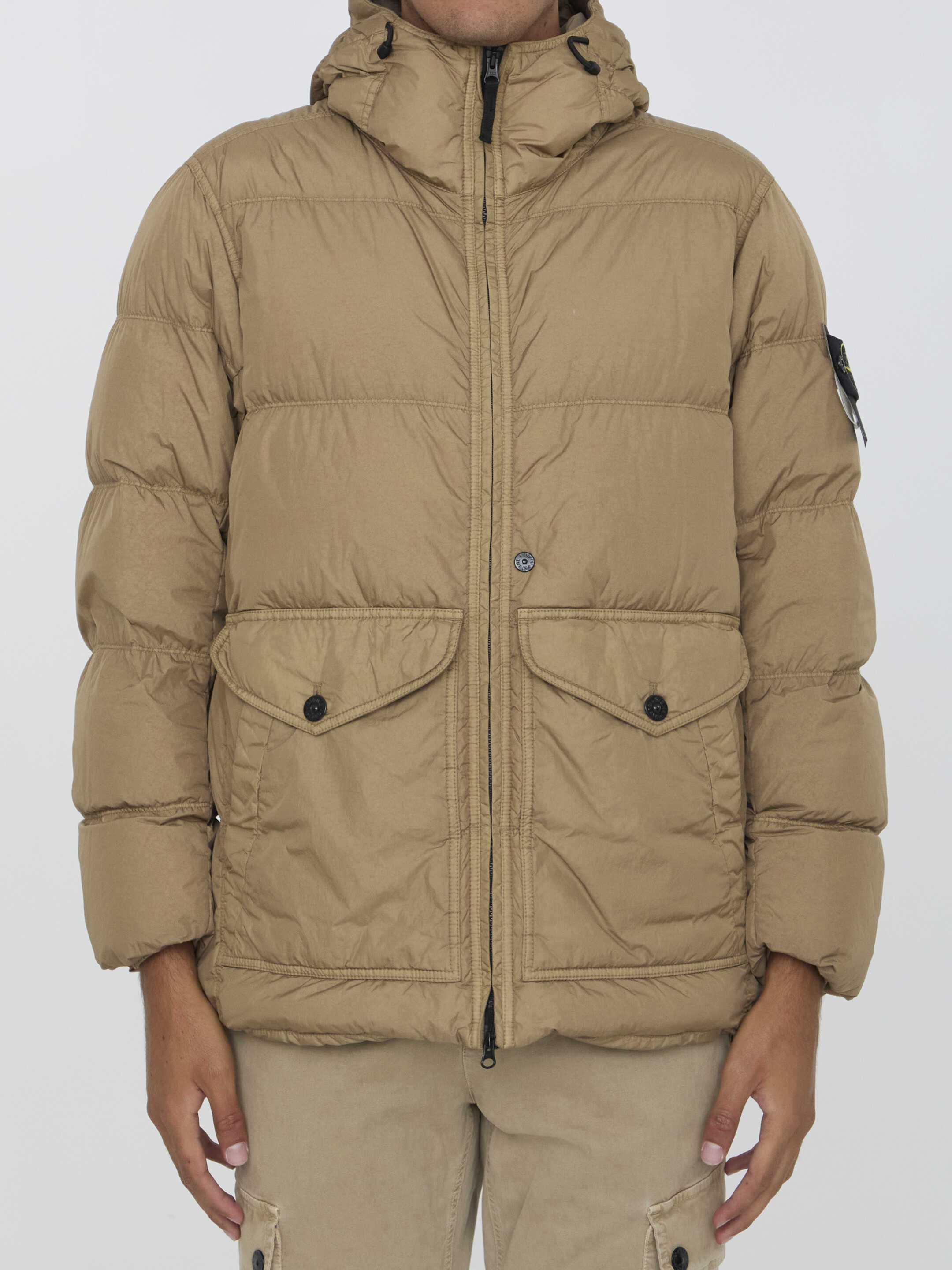Crinkle Reps R-NY down jacket in beige nylon with crinkled effect and with down filling. It features drawstring hood, front two-way zip closure, two side press-stud welt pockets, two front buttoned flap pockets, Compass patch on left sleeve, elasticated cuffs and drawstring on hem. Regular fit.