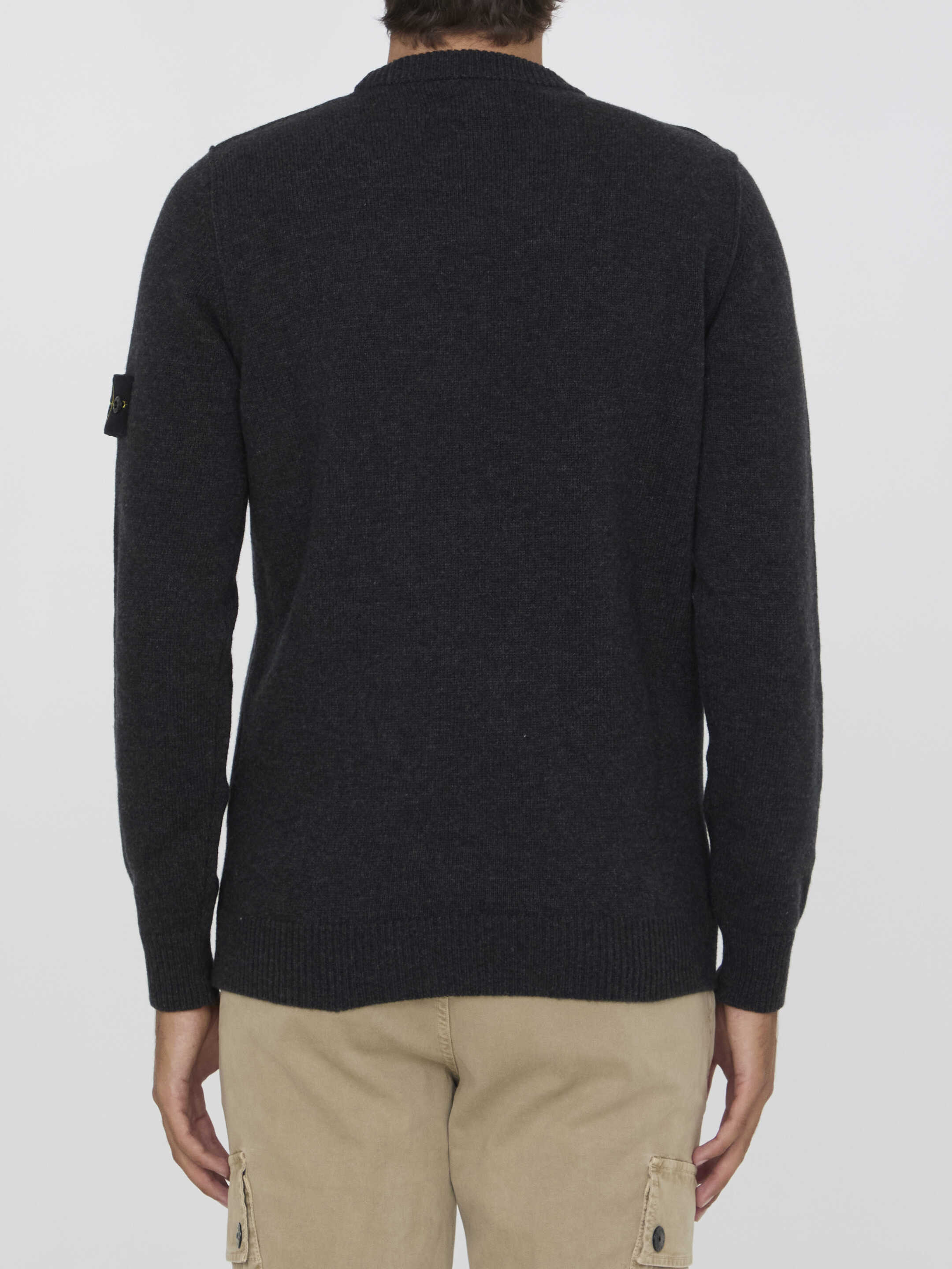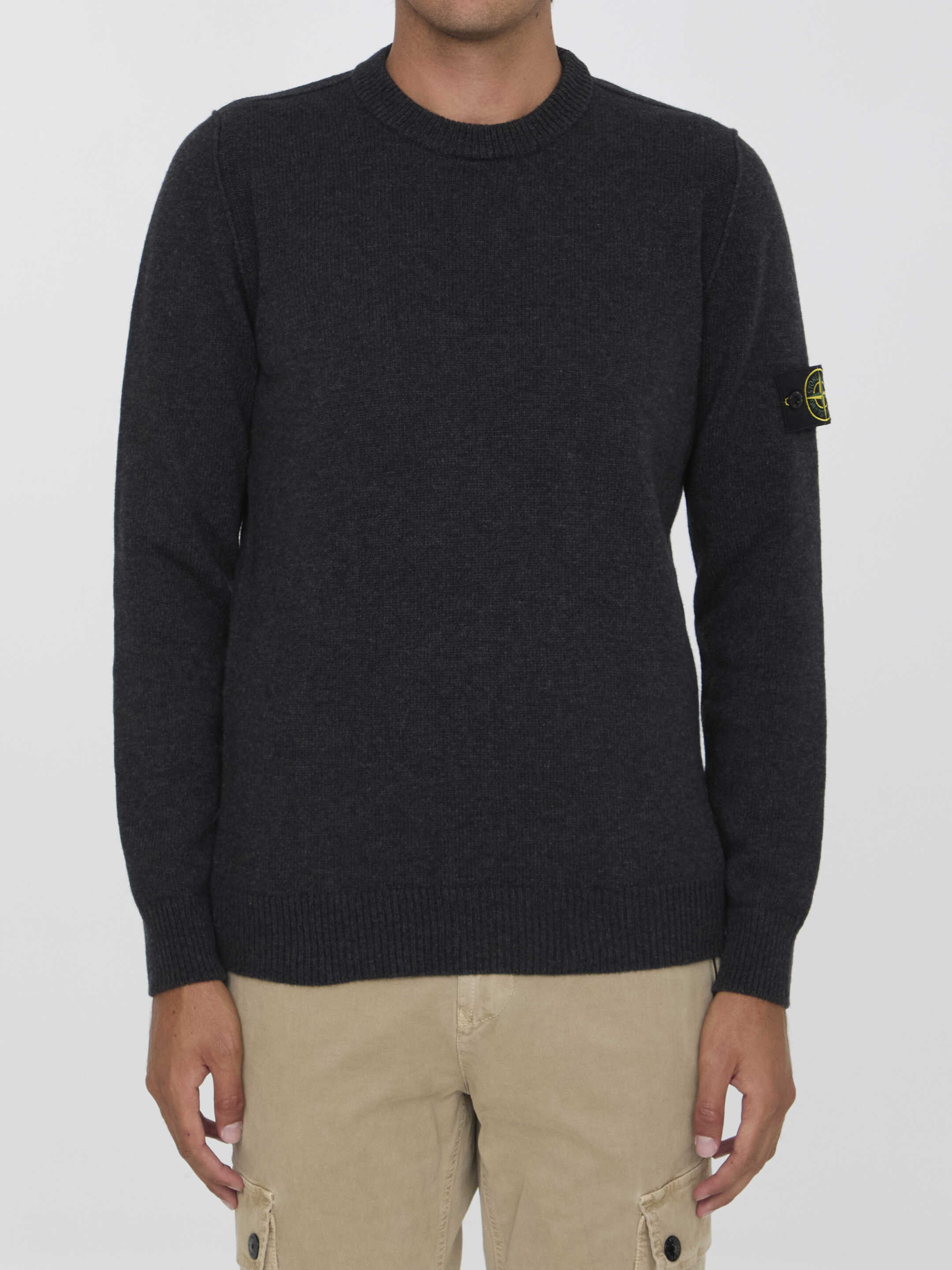 Long-sleeved crewneck sweater in anthracite wool blend. It features Compass patch on left sleeve and ribbed trims on collar, cuffs and hem. Regular fit.