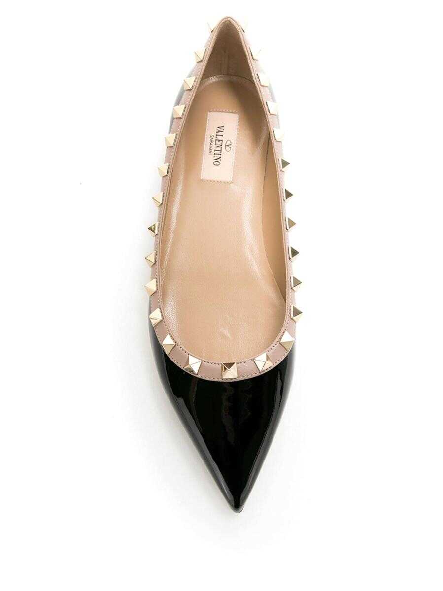 black/powder pink patent leather contrasting trim gold-tone Rockstud embellishment pointed toe branded leather insole flat sole slip-on style HEEL: 1.0 Centimetres HEIGHT: 6.0 Centimetres Inside Sole: 25.5 Centimetres