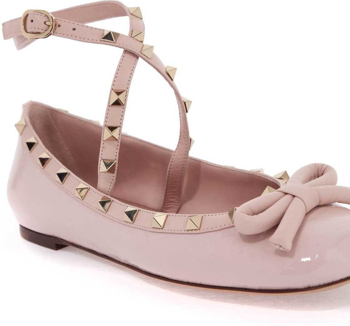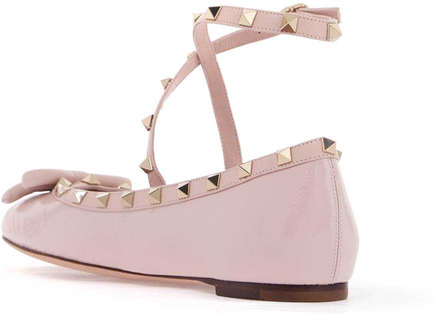 Valentino Garavani's Rockstud ballerina flats are crafted in glossy patent leather and adorned with a bow on the toe and platinum-finished studs. They feature leather trims and an adjustable ankle strap, as well as a leather interior with a logo label on the insole and a leather sole.