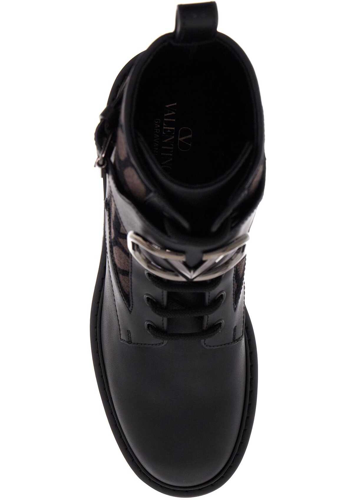 Valentino Garavani ankle boots made of smooth leather and Iconographe Toile fabric with VLogo Signature decoration in ruthenium-finished metal. The back of the upper is wrapped in an adjustable strap and features a ring pull tab. Leather interior and rubber lug sole complete the design.