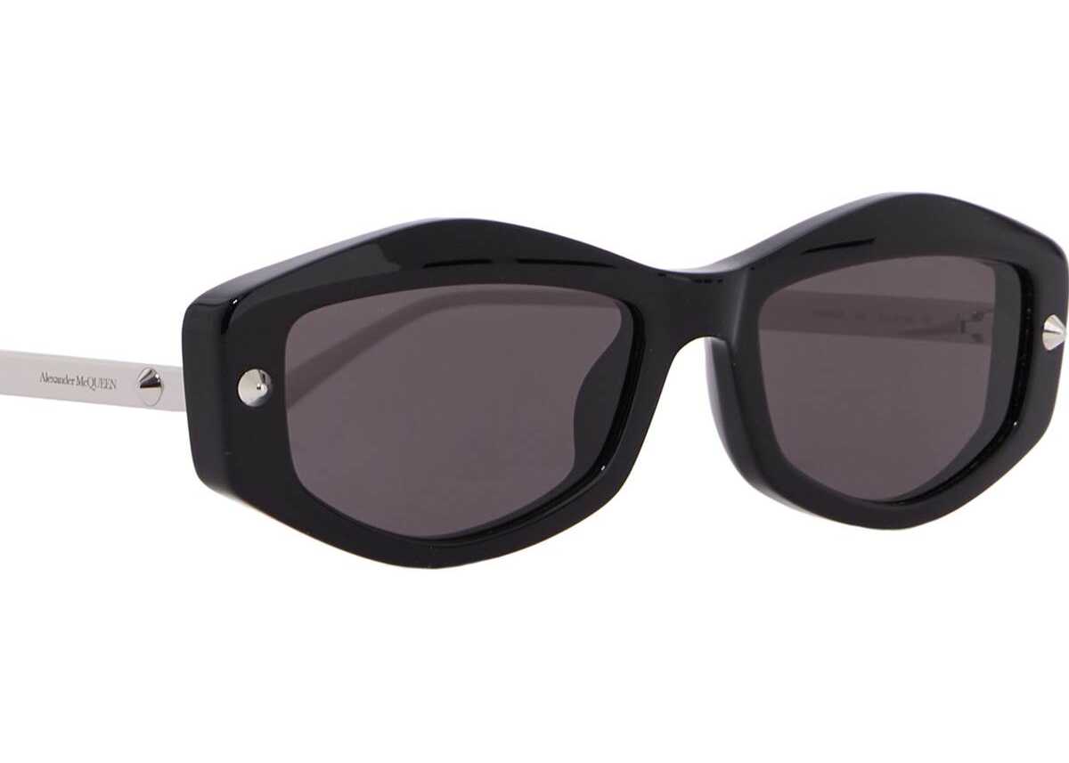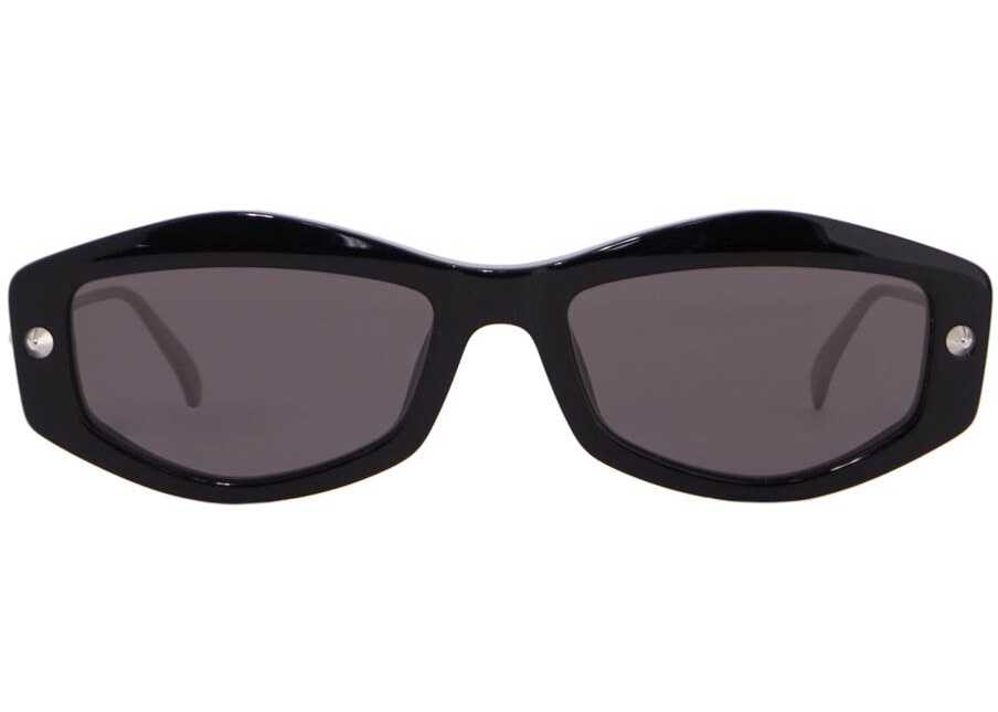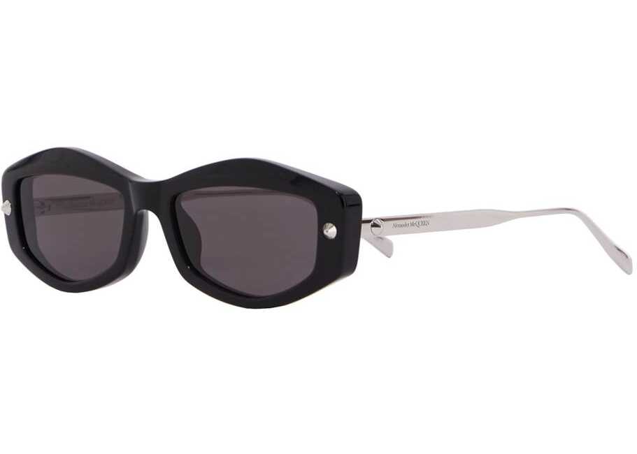 Alexander McQueen sunglasses with a geometric frame made of recycled acetate and embellished with silver studs on the front and engraved metal temples. Smoke lenses, 100% UV protection. Protective case included.