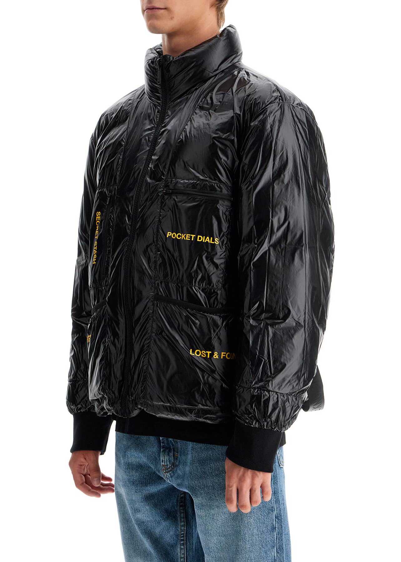 Reversible Moose Knuckles down jacket, padded with 90/10 duck feathers. It features a straight cut with a stand-up collar, adjustable hem, zip closure and ribbed windproof cuffs. The outer side in matte nylon has side pockets with snap buttons and a logo patch on the sleeve. The inner side in shiny nylon is enriched with four pockets with lettering prints, adjustable and removable shoulder straps, and a printed logo on the chest. The model is 187 cm tall and wears