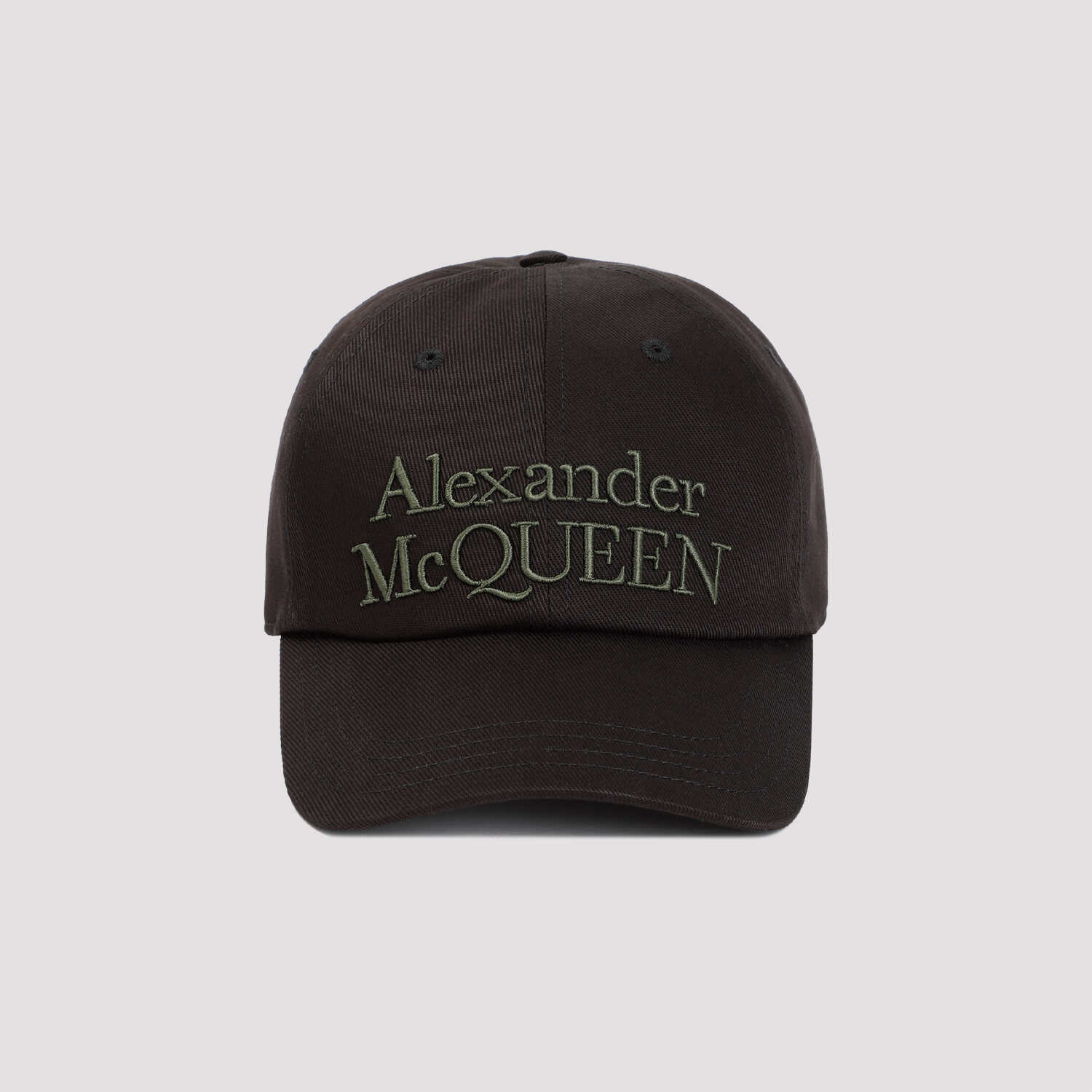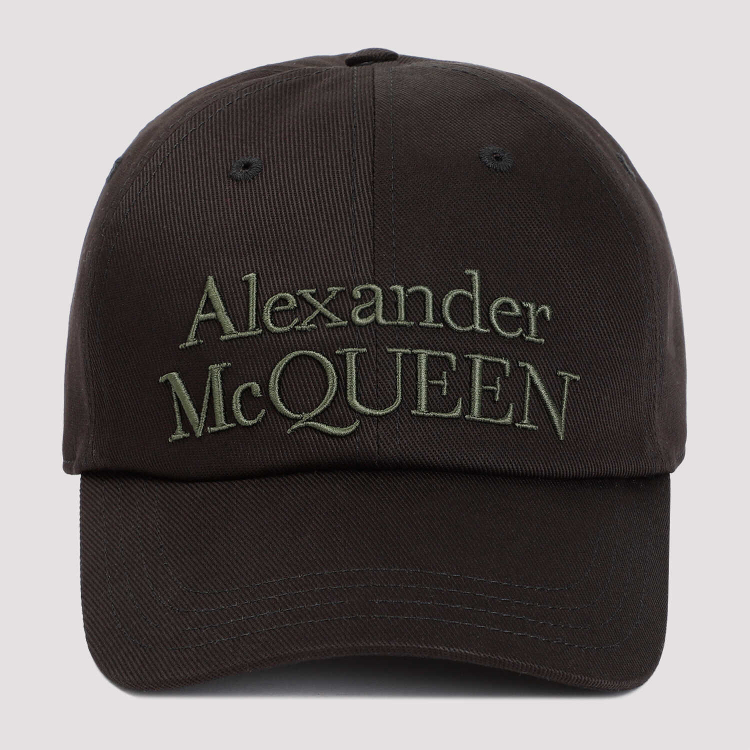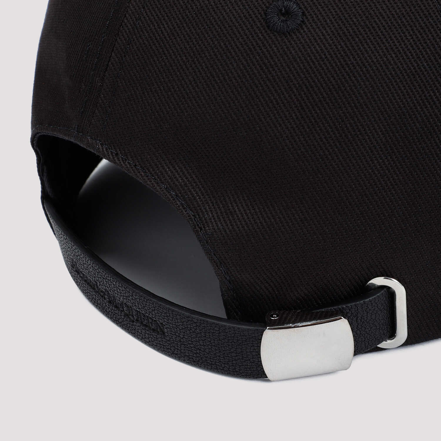 Alexander McQueen Black Cotton Stacked Hat. Pure black cotton hat, six-panels construction, front green khaki embroidered logo, tonal visor, back adjustable strap with silver-tone buckle.