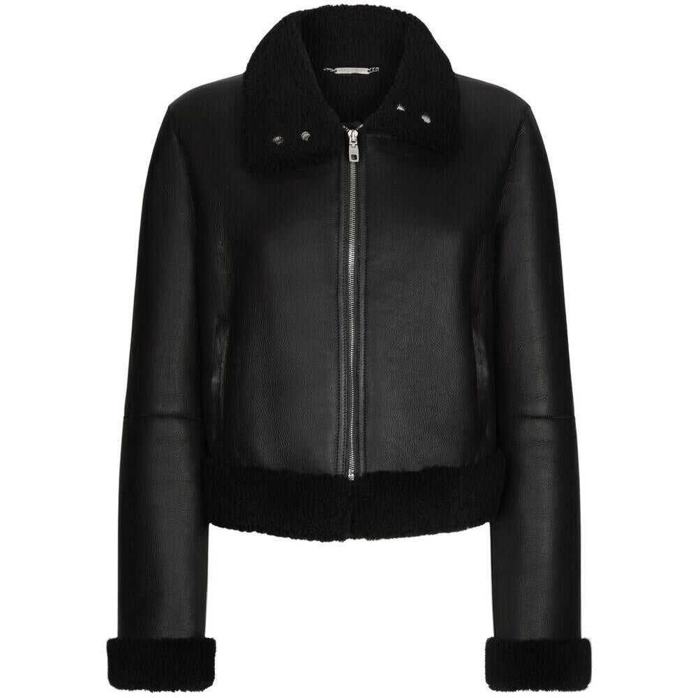 Black lambskin shearling contrasting cuffs front zip fastening high neck slip pockets to the sides silver-tone hardware