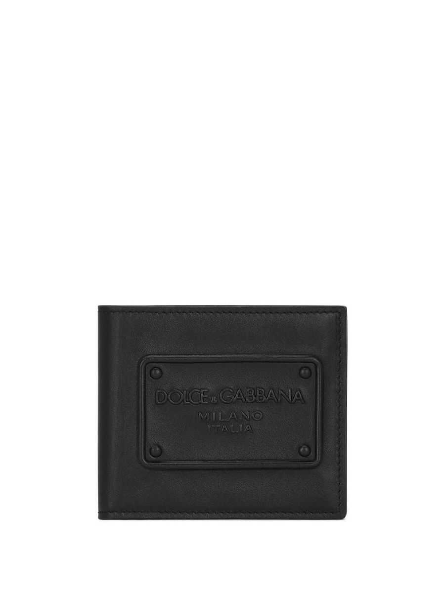 Deep black, calf leather, pleated design, front logo patch, internal card slots and bill compartment.
