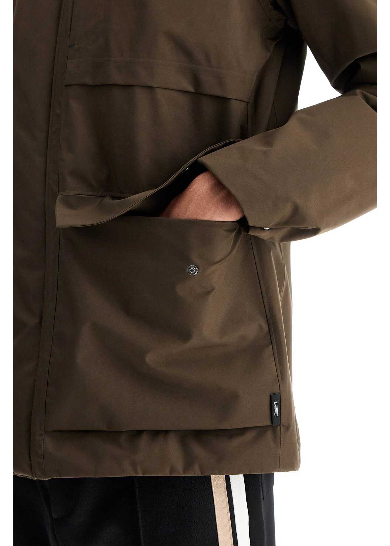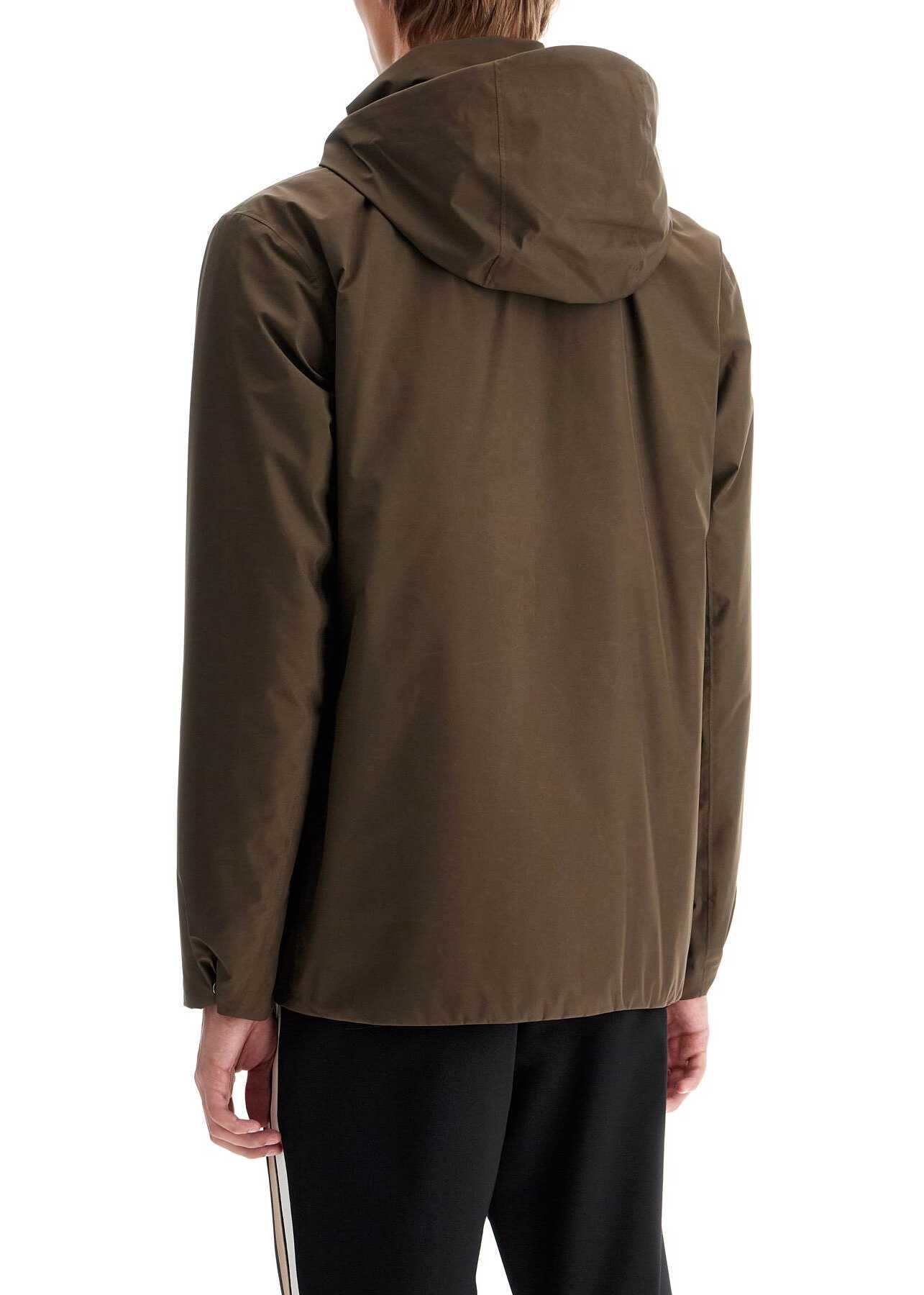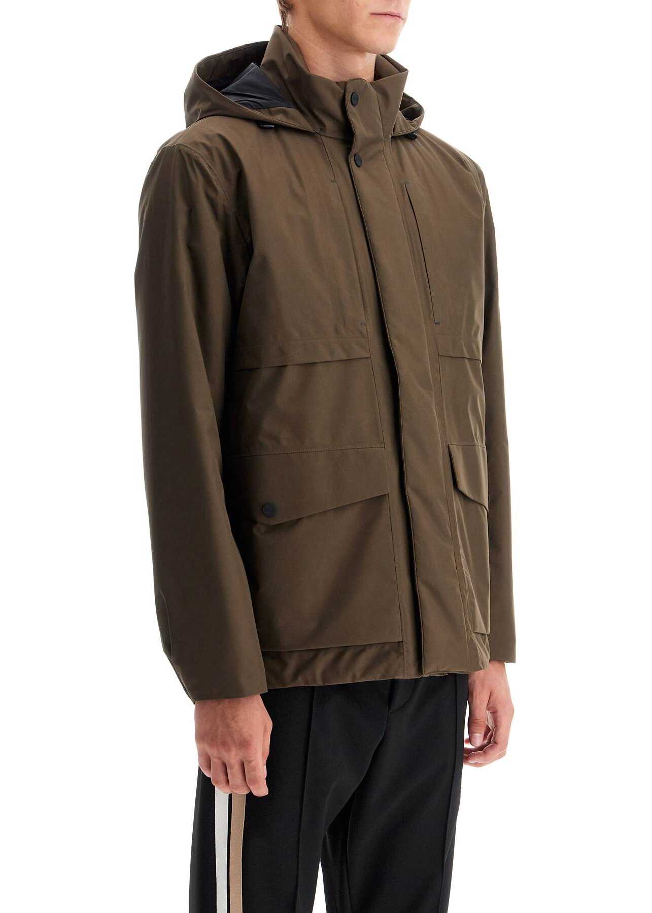 The Gore-Tex field jacket from Herno's Laminar collection is made with water-repellent fabric and features a light polyester padding and heat-sealed seams. The design includes a stand-up collar with adjustable hood, a two-way zip closure with hidden snaps, and four external pockets. The straight cut can be adjusted with internal drawstrings at the waist and hem. The interior is lined with pockets and has a regular fit. The model is 187 cm tall and wears size IT