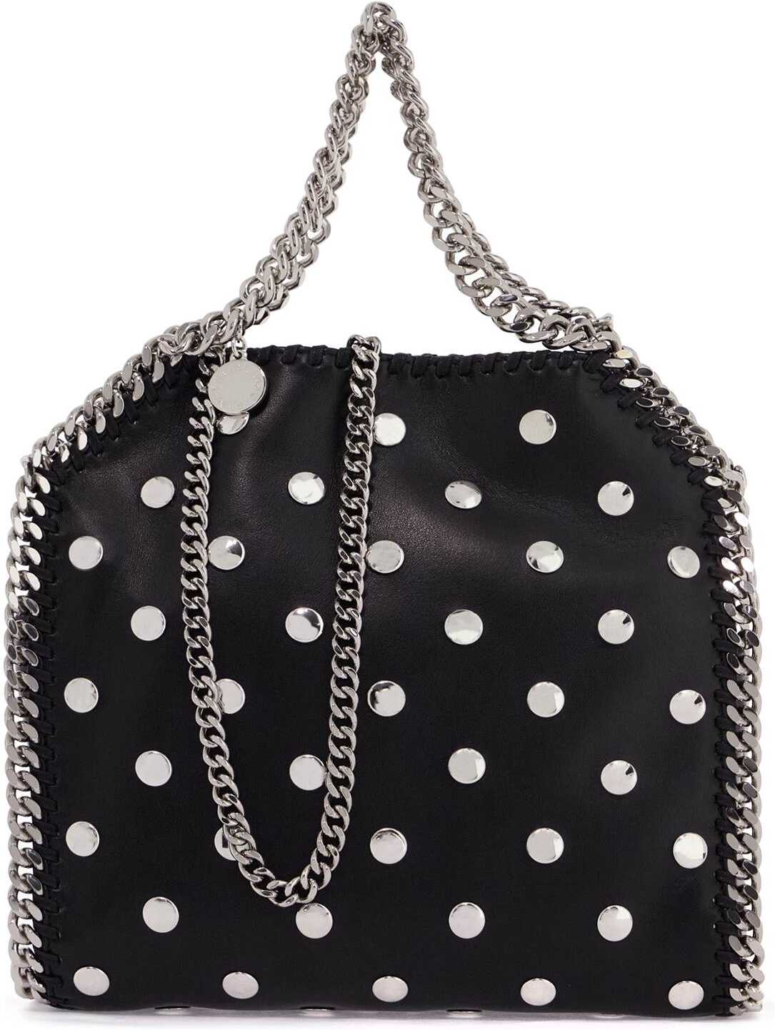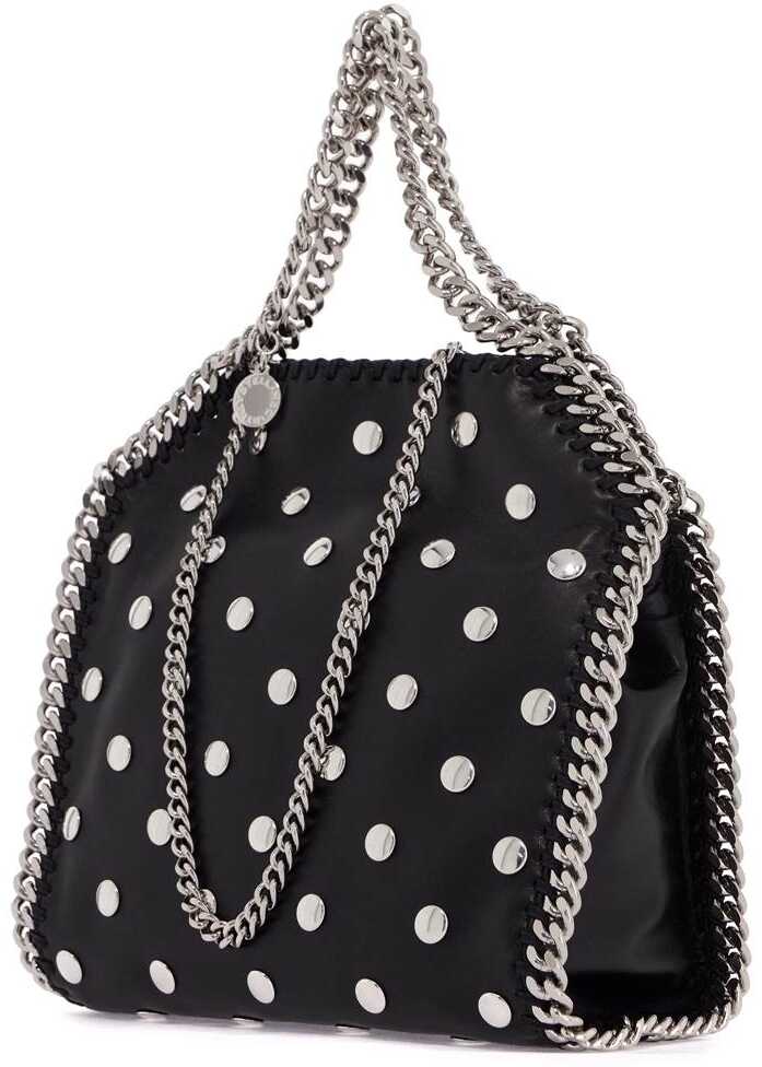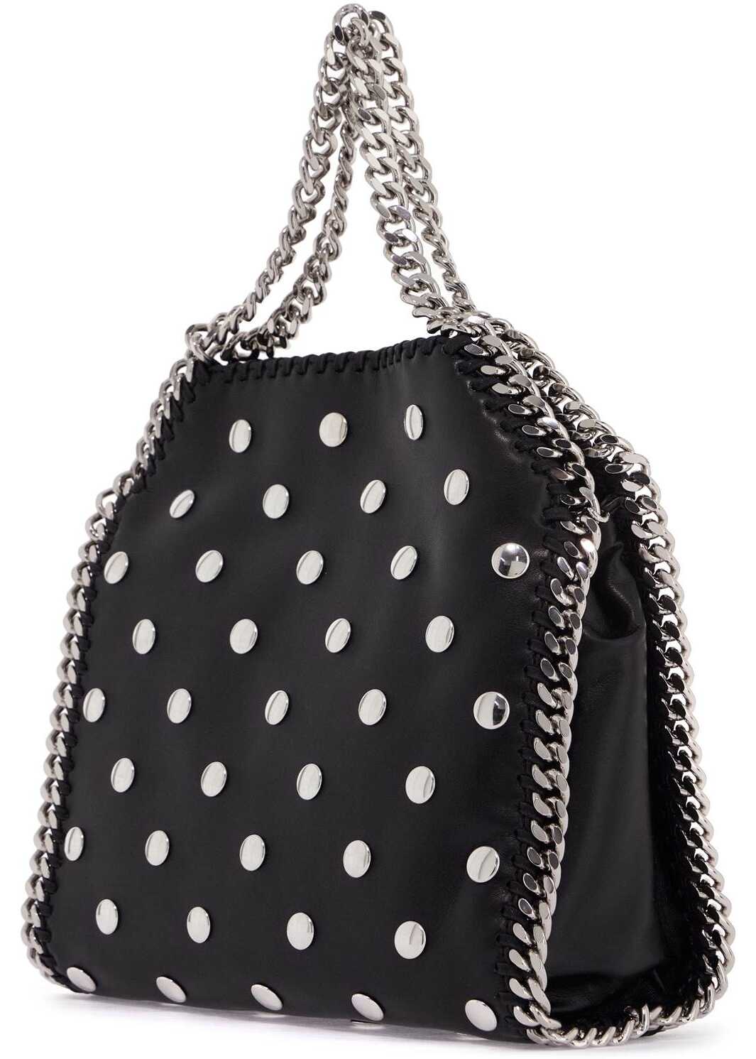 The Stella McCartney Falabella Mini bag is made of soft Alter Mat eco-leather, embellished with flat studs all over and characterized by its edges, double handle, and chain shoulder strap in recycled brass and aluminum. It features a magnetic button closure, a lined interior with a branded fabric pocket, and an iconic Stella logo medallion and silver-finished metal accessories.