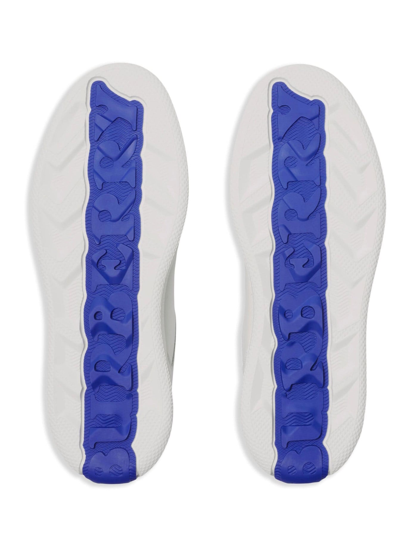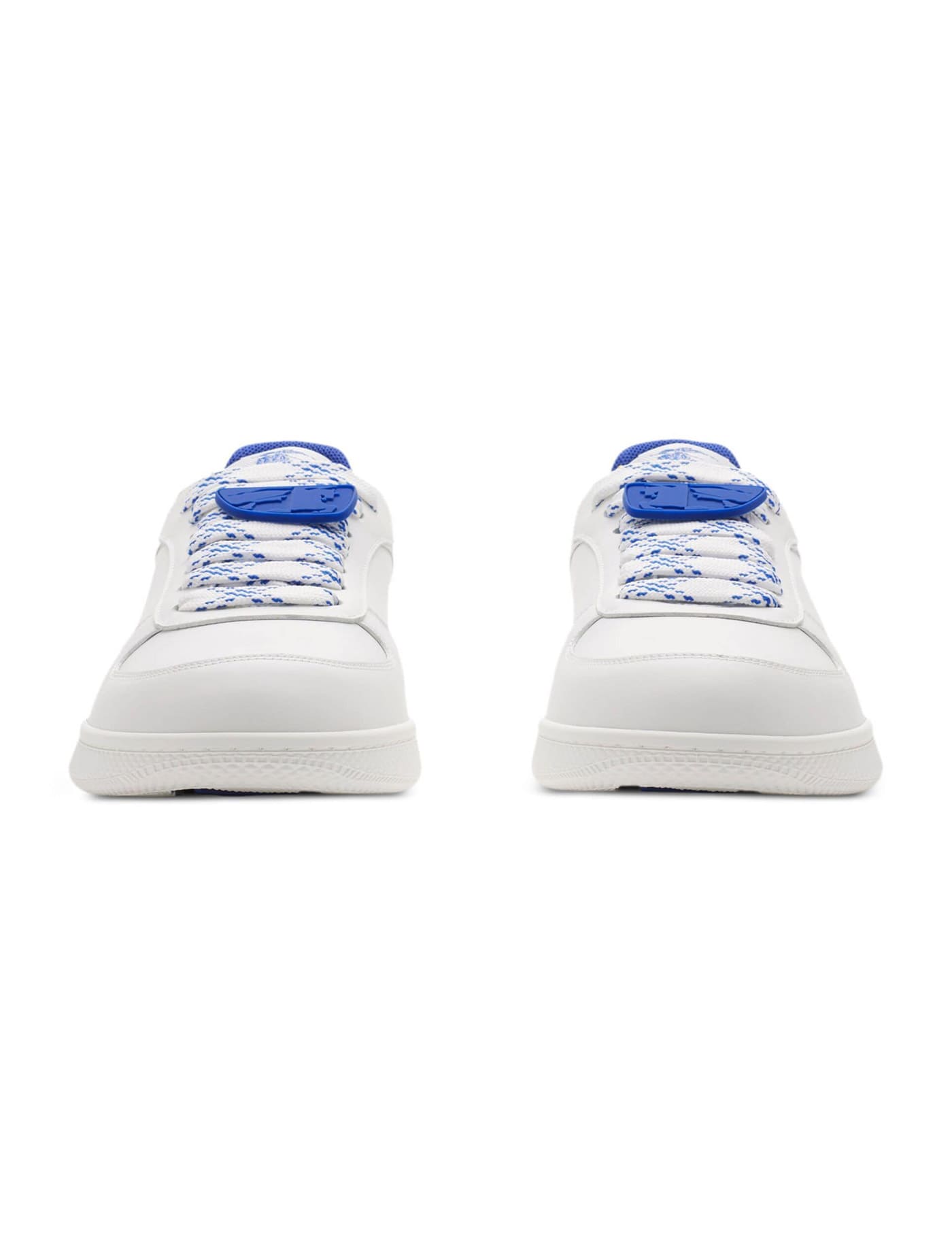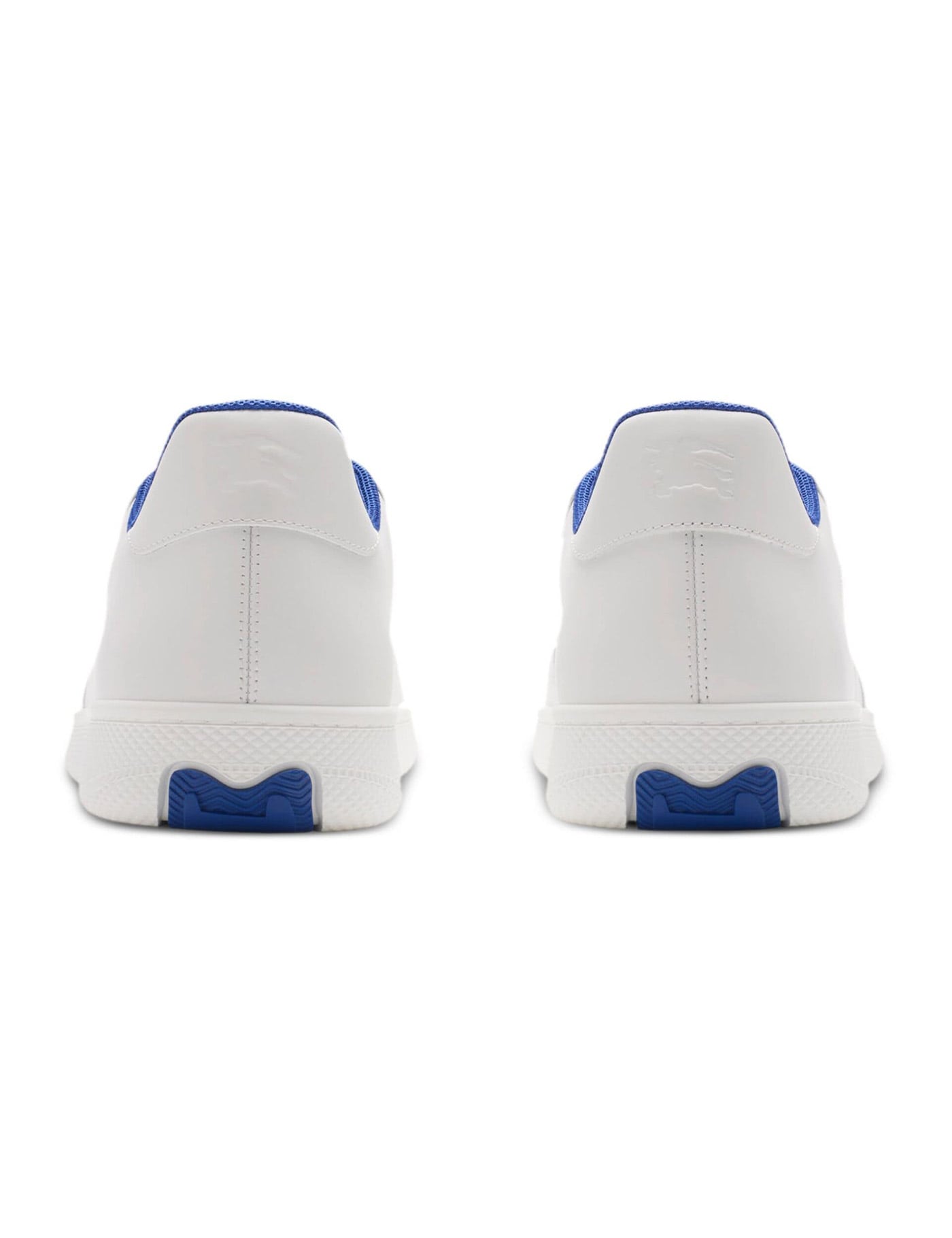 Terrace Sneakers in white calf leather, with a detachable shield charm embossed with the Equestrian Knight Design. They feature round toe, leather insole, Equestrian Knight Design label at tongue and check laces and rubber soles with Burberry lettering. Dust bag included. Additional laces included. Any leather imperfections are not to be considered manufacturing defects, but a peculiarity of the material.