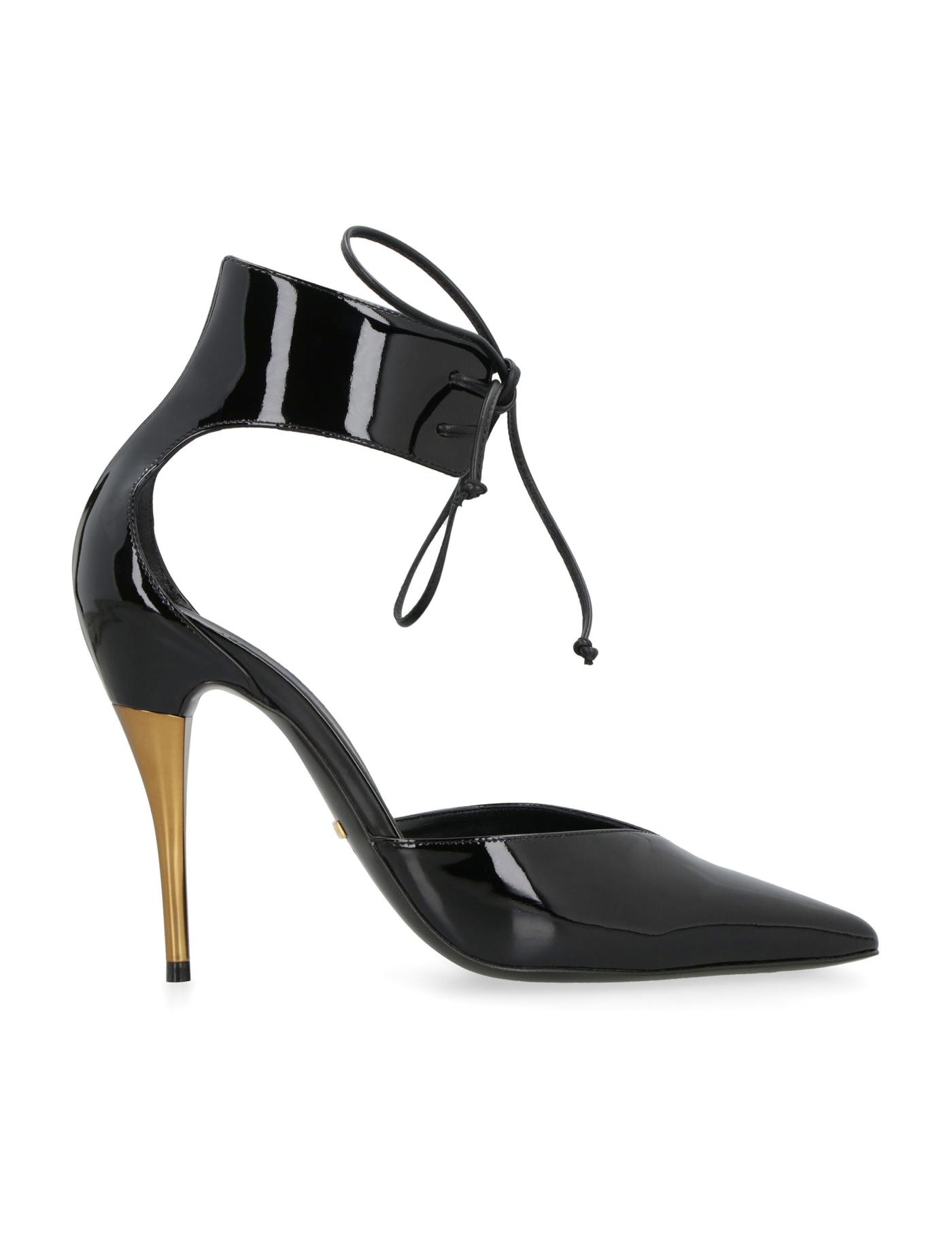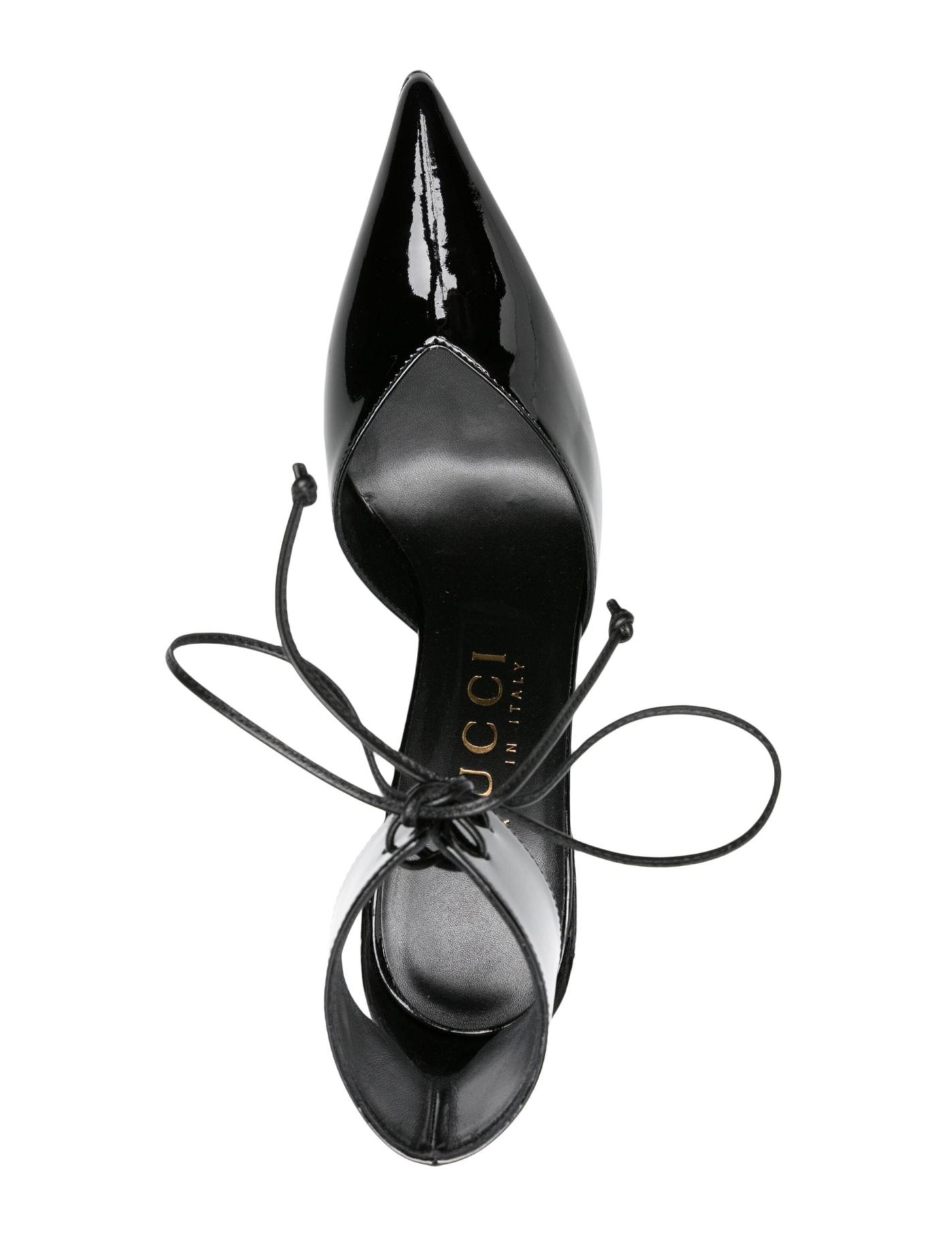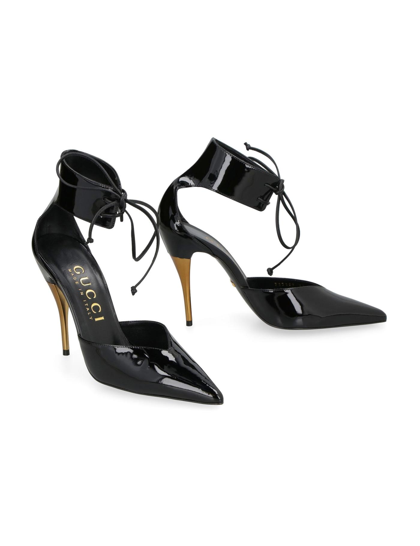 This SS23 Gucci reinvents some of the brand's historic classics by delving into the Italian House's past. These pointed pumps are made of black patent leather, inspired by styles from the houses archives. This pair has a classic charm thanks to the front tie-fastening, pointed toe and contrast high heel.