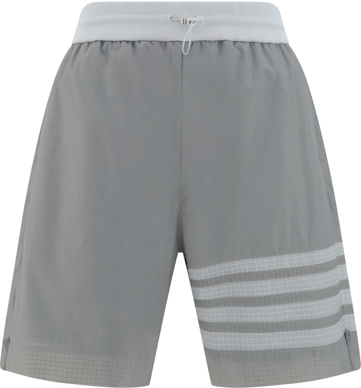 Shorts by Thom Browne, elasticized waistband with adjustable drawstring, two welt pockets on front, iconic white bands on left leg, monochrome pattern, regular fit.