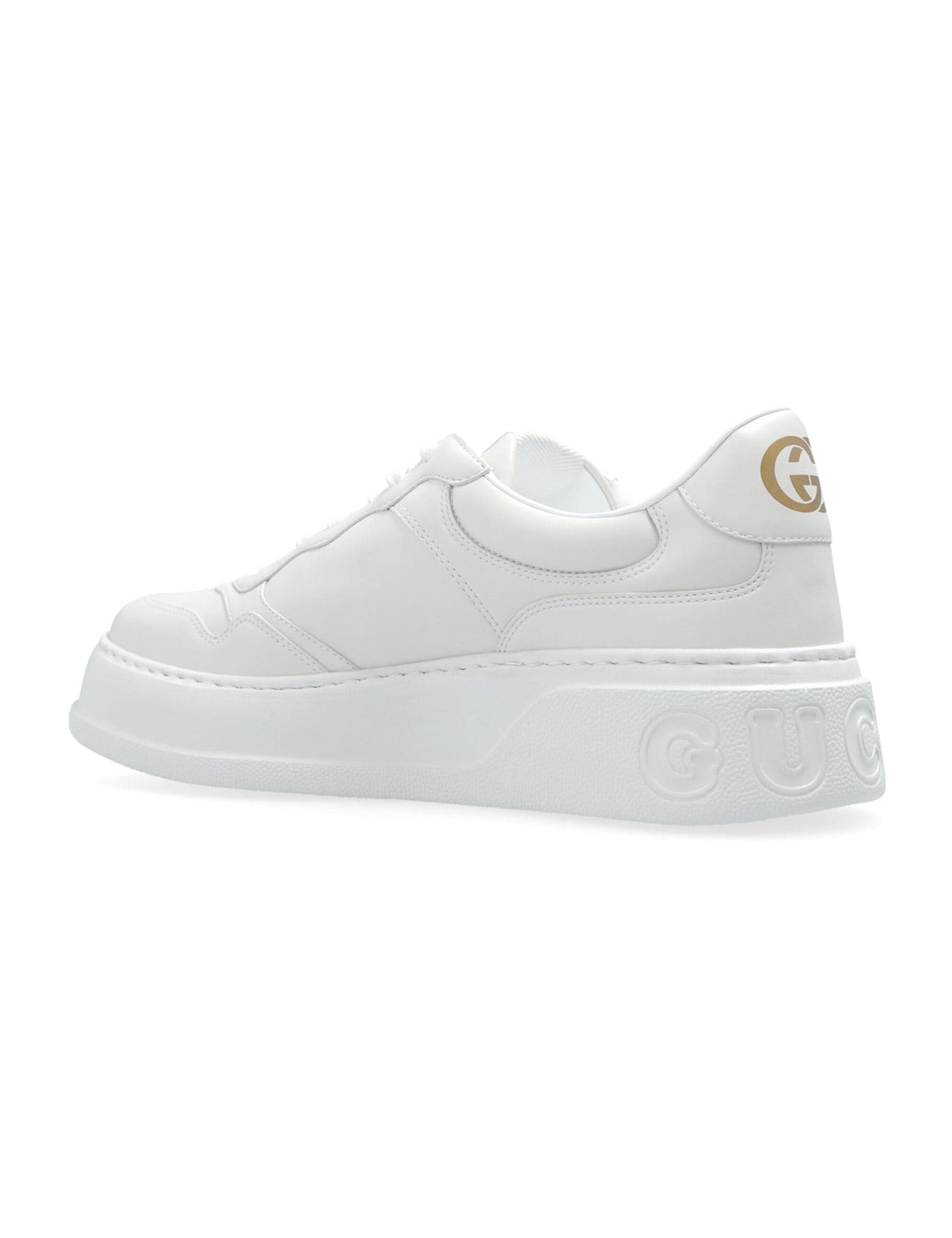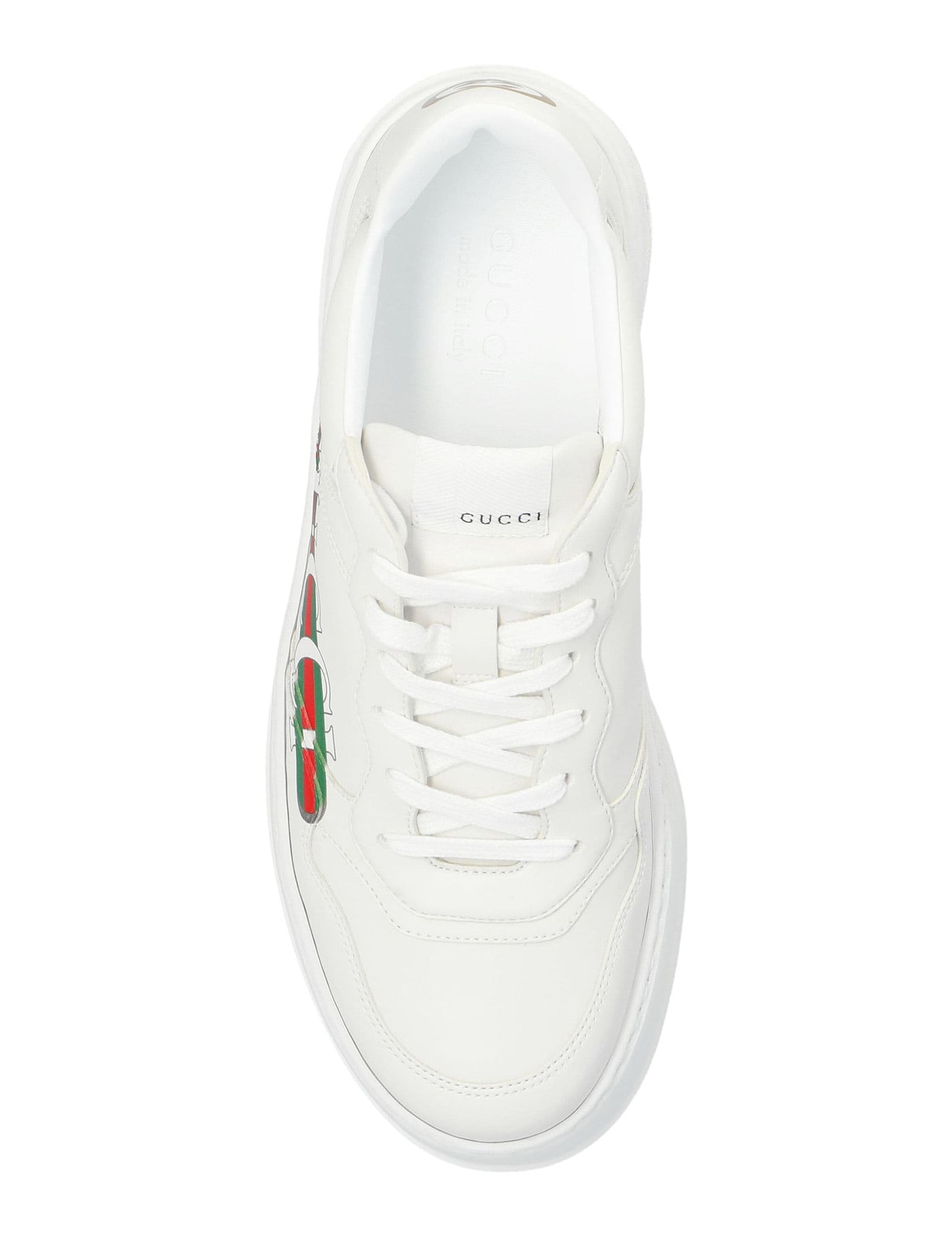 These oversized sole sneakers feature a retro look and are made of white Demetra, an innovative material created from renewable plant raw materials. The Gucci Web print and heel detail complete the modern design.