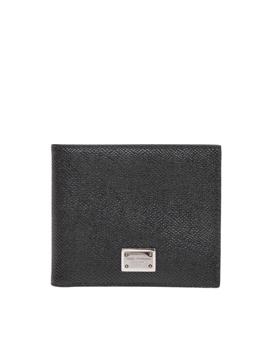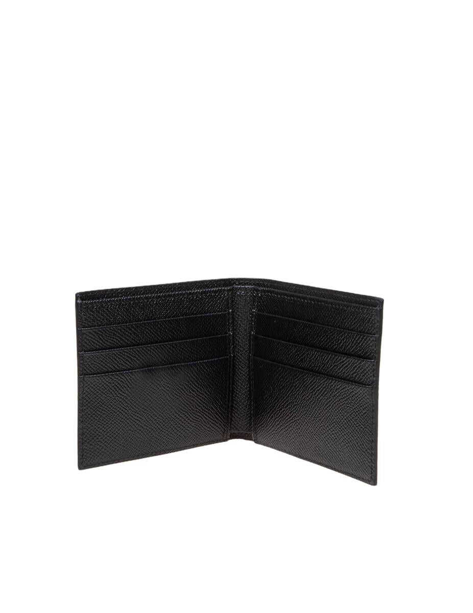 Dauphine leather wallet Black colour Six card slots Two side compartments Banknote compartment on top Front metal logo plate Measurements: 11 x 8.75 x 2 cm