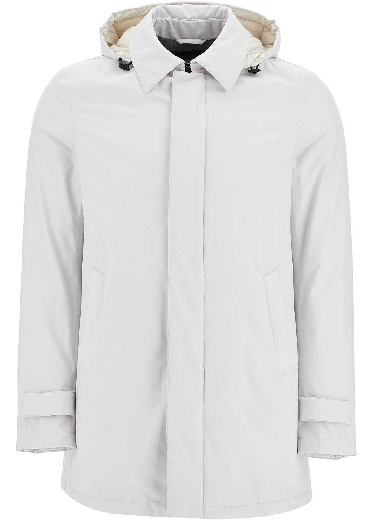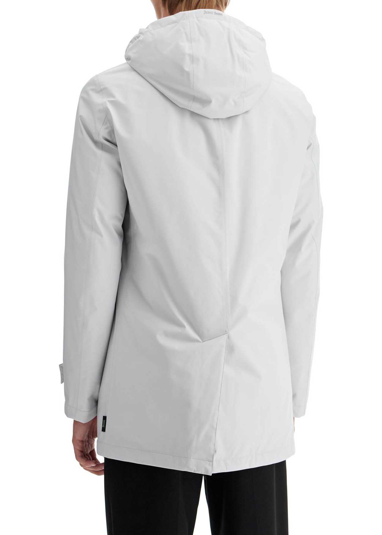 Midi jacket from the Laminar collection by Herno, made of Gore-Tex Paclite Shell 2L, a waterproof, windproof and breathable technical fabric. Carcoat design featuring concealed double-slider zip and snap fastening, pointed collar with hook-and-eye, adjustable and removable hood, welt pockets with hidden snap, internal windproof cuffs in technical jersey, center back vent. It is lined in quilted nylon and padded with lightweight 80/20 goose down. One inside pocket, logo detail printed on the edge of the hood. Regular fit. The model is 187 cm tall and wears a size IT 48.